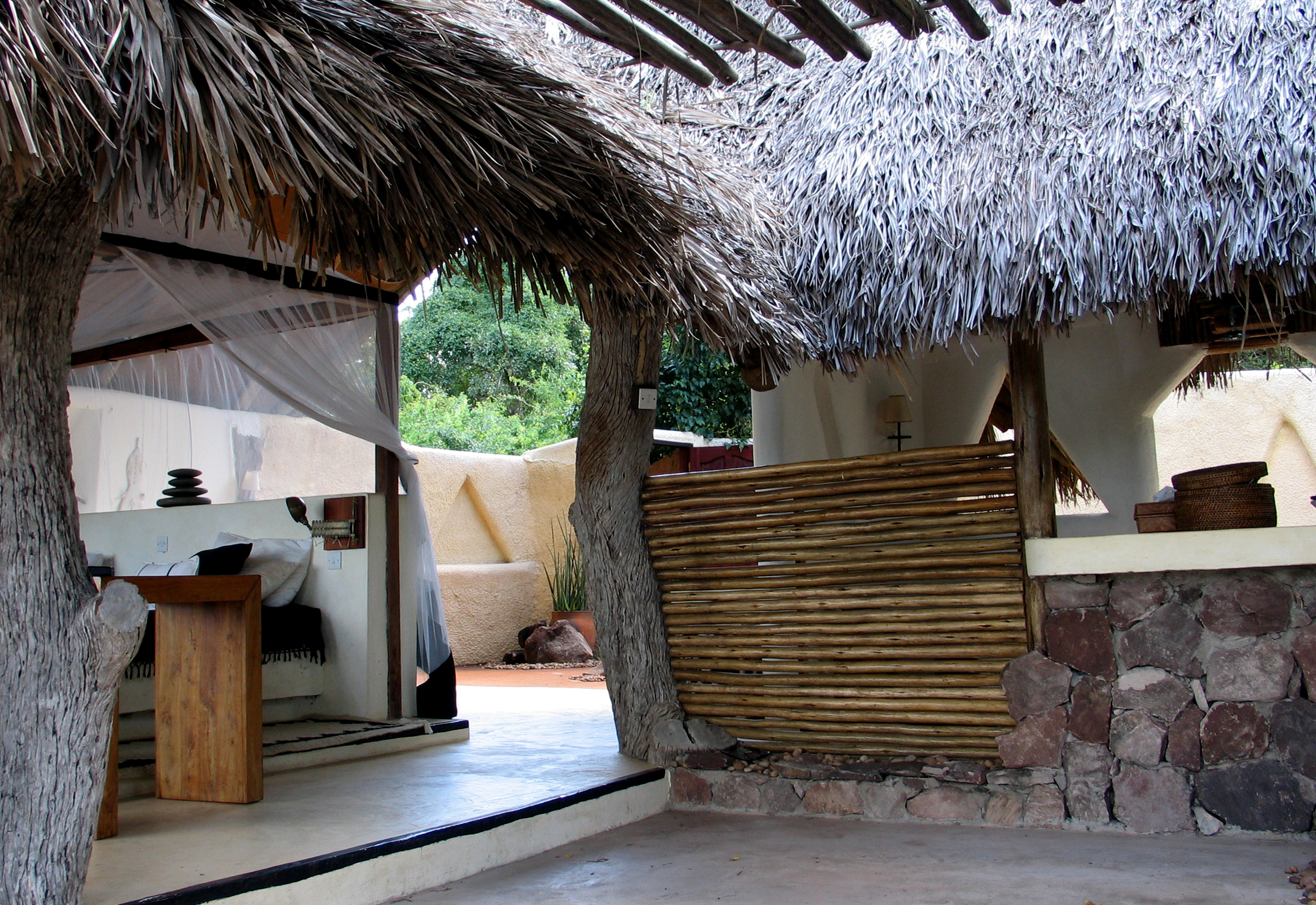 Ein sehr großer, bärtiger Mann kommt auf uns zu. Ich fange gerade an, mich vorzustellen, da unterbricht er mich und sagt, wir können auch deutsch reden. Klaus ist Kenia-Deutscher und leitet die Lodge. Er zeigt mir die Zimmer, die man eigentlich nicht Zimmer nennen kann, auch nicht Zelte oder Chalets, aber wie denn dann? Auf der Firmen-Website werden sie Cottages genannt, das wird ihnen aber auch nicht gerecht. Auf der Rückseite jedes – nun ja – Cottages ist eine gemauerte Wand, die anderen drei Seiten sind offen – hier endet die Wand in Brusthöhe. Sonnenlicht durchflutet den Raum. Hinter dem breiten Doppelbett wachsen in einer Art Innenhof Pflanzen und sogar kleine Bäume. Das Badezimmer ist zu allen Seiten offen, man sieht also beim Duschen oder Zähneputzen auf den Fluss. Zum Fluss hin lädt eine breite Aussichtsterrasse zum Verweilen ein. Viel Platz, viel Licht. Über das alles spannt sich ein ausladendes Reetdach. Das einzige, was komplett zu schließen ist, ist das Moskitonetz ums Bett herum. Zwischen den einzelnen Cottages ist so viel Grün und so viel Abstand, dass man von seinen Nachbarn nichts sieht und hört.