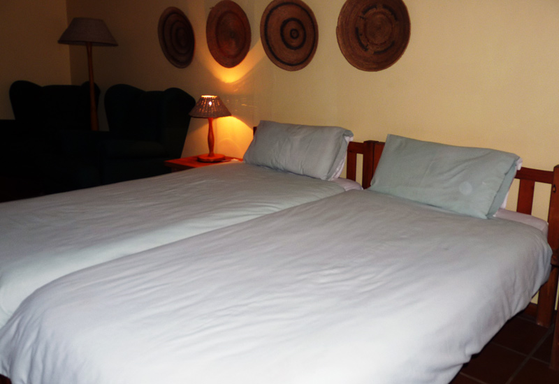 Erst am späten Nachmittag kommen wir am Drifters Zululand Inn an. Es gibt nur drei Zimmer, wir sind die einzigen Gäste. Die Zimmer sind riesig, wir bekommen eines für die Großen und eines für die Kleinen. Leider regnet es so stark, dass wir die tolle Umgebung gar nicht richtig genießen können. Gleich machen wir es uns gemütlich und verspachteln die mitgebrachten Lebensmittel. Müde von der langen Fahrt fallen wir ins Bett, nicht ohne vorher das Zimmer gründlich nach Plagegeistern durchsucht zu haben. Meine Alexandra ist ein wenig panisch, weil ich ihr gesagt habe, daß es hier die gefährlichen Mücken gibt. Auf Nachfrage wird mir aber versichert, daß das Malaria-Risiko hier verschwindend gering ist. So verzichten wir zum ersten Mal auf eine Prophylaxe.Am nächsten Morgen regnet es noch leicht. Wir überlegen, was wir tun sollen und entschließen uns dann nach dem Frühstück doch gleich in den Hluhluwe Umfolozi Nationalpark zu fahren. Das wird unsere erste Pirschfahrt ohne Führung und im PKW. Das Anmelden geht recht einfach, wenn auch afrikanisch umständlich. Ich kaufe noch eine Karte und los geht’s. Gleich nach dem Eingang treffen wir auf einen Giraffenkindergarten und ich fühle mich zum ersten Mal, wie im „Jurassic Park“. Vom PKW aus hat man einen völlig anderen Blickwinkel auf Natur und Tiere – nämlich von unten. Das ist sehr ungewohnt für mich und eine ganz neue Erfahrung. Mein Mann ist ein geübter Tierspäher und so haben wir wirklich viel Glück. Wir sehen Nashörner, Zebras, Gnus, Nyalas oder auch Impalas. Es soll hier auch Löwen geben, die zeigen sich aber leider nicht. Der Himmel ist bedeckt, aber es regnet Gott sei Dank nicht. Wir bleiben auf den größeren Schotterstraßen und haben eine Menge Spaß. Erst am frühen Nachmittag geht es wieder heraus aus dem Park. Am Ende kommt noch das Highlight des Tages – eine Nashornmutter mit ihrem Kalb läuft genau vor unserem Wagen über die Asphaltstraße. Was für eine Aufregung!