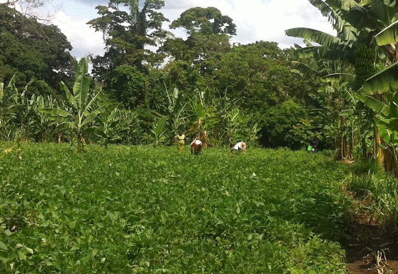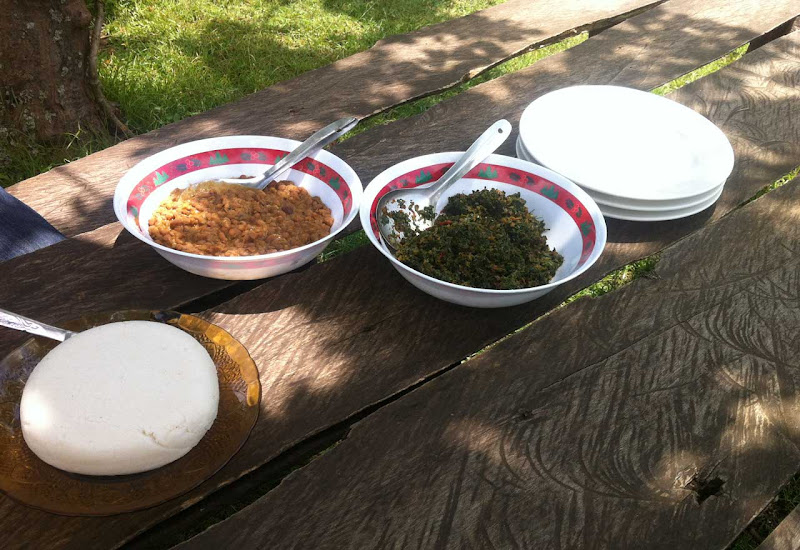 Das Mörsern ist eine anstrengende Angelegenheit, wie ich schnell feststelle. Mama Sofias Tochter kommt aus der Schule - nach den raspelkurzen Haaren zu urteilen geht sie auf eine öffentliche Schule- und hilft beim Stampfen der Kaffeebohnen. Wir probieren den Kaffee - er ist richtig schwarz und stark und voller Koffein, dass mir gleich durch den ganzen Körper strömt und mich ganz hibbelig macht. Ich bin ja kein großer Kaffeetrinker, entsprechend intensiv wirkt der Koffein-Kick bei mir. Dazu gibts eine Banane, die ebenfalls viel intensiver als unsere Supermarktbananen schmeckt.Der Besuch der Toilette stellt eine weitere kulturelle Erfahrung dar, es ist einfach nur ein Loch im Boden, dazu ein Eimer Wasser - kein Papier. Zum Glück habe ich Feuchttücher dabei und komme deshalb nicht in Verlegenheit. Wir ziehen weiter - ich gebe Mama Sofia ein Trinkgeld, denn ein Honorar für die Vorführung und Bewirtung bekommt sie offiziell nicht. Nach einer weiteren Stunde Wanderung durch das tropische Pflanzenparadies kommen wir zu einer weiteren Hütte - hier gibt es Mittagessen bei Rosi.Ein paar kleine, schmutzige Nachbarskinder schauen neugierig vorbei. Wir bekommen Wasser für unsere Hände, denn wir essen mit den Fingern. Nach einer kurzen Unterweisung geht es los. Das weiße Maisbrot dient als Unterlage für die Bohnen und den Spinat, beides sehr würzig zubereitet. Das Brot leicht zusammendrücken und schnell rein in den Mund. Es ist so lecker, dass ich die ganze Schüssel allein essen könnte. Eine sehr authentische Erfahrung, denn in den Lodges und Camps isst man ja immer gesittet mit Messer und Gabel.