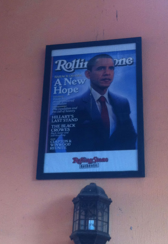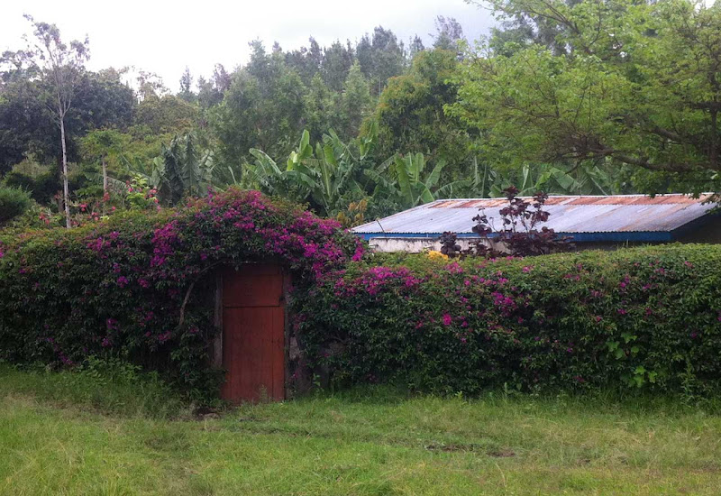Auf unserer letzten Etappe begegnen uns junge Frauen mit großen Wasserkanistern und mir wird wieder einmal klar, wie luxuriös unser Leben mit Wasserleitungen und Heißwasser aus der Leitung so ist. Wir kommen an einem Ficus Benjamini vorbei - die beliebte deutsche Zimmerpflanze ist hier ein riesiger Baum mit dicken Wurzeln. Roman posiert für ein Foto, damit man die reale Größe sehen kann. Von den Baumwipfeln rieseln Blätter herab - zwei Colobusaffen springen von Ast zu Ast. Man kriegt sie nicht vor die Kamera, höchstens ein puscheliger weißer Schwanz ist einmal kurz zu sehen. Unser Zielpunkt ist ein kleines Dorf mit einigen Hütten, einer Kirche und einer Kneipe, deren Wände lustige Bierplakate und ein Titelblatt des Rolling Stone mit Barack Obama zieren. Wir trinken etwas, während wir auf unseren Shuttlebus warten, der uns zur Ngurdoto Lodge zurückbringt.