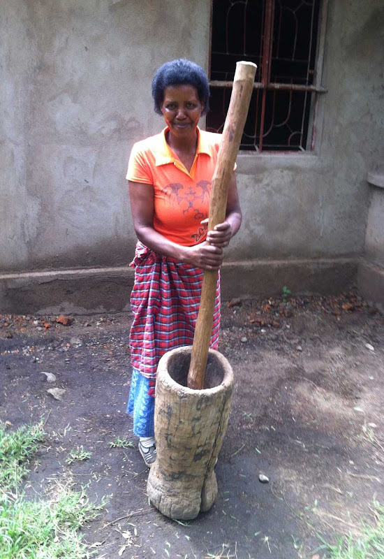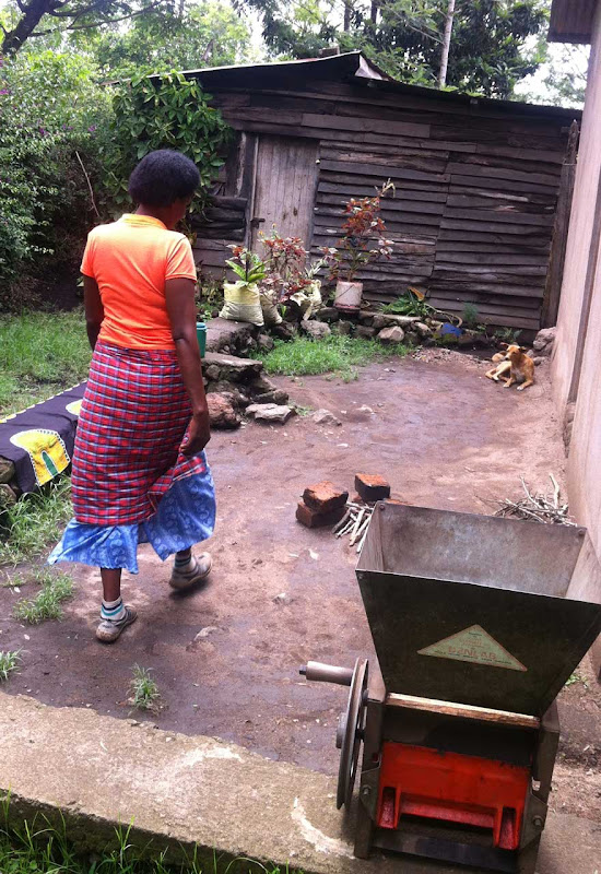 Nach ca. anderthalb Stunden Wanderung und vielen wissenswerten Informationen von Roman kommen wir zu einer kleinen Shamba, die von Mama Sofia betrieben wird. Sie führt uns vor, wie der Kaffee vom Strauch in die Tasse kommt. Hier ist alles Handarbeit, nicht wie auf den großen Plantagen, wo Maschinen und ein Röstofen die Arbeit übernehmen. Einen solchen Ofen habe ich ja bereits im Ngorongoro Farm House gesehen. Die Genossenschaft, der Mama Sofia angehört, hat ihr lediglich eine mechanische Mühle zur Verfügung gestellt. Für uns macht sie die Vorführung aber ganz traditionell mit dem Mörser.Die reifen roten Kaffeekirschen werden per Hand vom Strauch gepflückt - das kann auch auf den großen Plantagen keine Maschine- und dann werden die Kerne aus dem roten Fruchtfleisch herausgepult. Nachdem sie in der Sonne eine Weile getrocknet wurden, werden sie im Mörser vorsichtig etwas gestampft, damit sich das Pergamenthäutchen, dass die rohen Kaffeebohnen umschließt, aufreißt und dann durch Hochwerfen in einem flachen Korb weg gepustet werden kann. Ohne die Entfernung des Häutchens würden sich die Bohnen nicht rösten lassen - es brennt leicht. Über einem offenen Feuer werden dann die enthäuteten Bohnen trocken bis zum gewünschten Röstgrad dunkelbraun geröstet. Das riecht herrlich. Anschließend werden die Bohnen im Mörser zerstampft und das Pulver wird mit kochendem Wasser überbrüht. Nach kurzem Durchziehen kann der Kaffee dann gefiltert werden und ist trinkbereit.