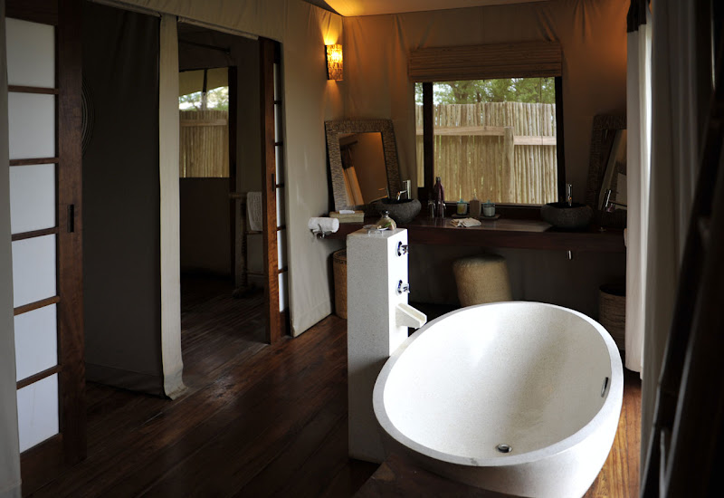 Das Badezimmer hat ebenfalls eine große Fensterfront mit Schiebetüren, und direkt am Fenster steht eine schön geschwungene Badewanne aus hellem Stein. Baden und dabei Tiere beobachten ist hier also möglich. An der Seitenwand steht der Doppelwaschtisch mit zwei großen Spiegeln und schicken, aus ausgehöhlten Felskugeln gemachten Waschbecken. Durch Schiebetüren abgetrennt sind eine separate Toilette und eine Dusche mit großem festem Duschkopf. Das Design des Zimmers gefällt mir sehr. Viel Schrankfläche, Ablage- und Aufhängemöglichkeiten, ein Safe, ein Walkie-Talkie für den Abholservice in der Dunkelheit, 24 Stunden Licht und Strom zum Aufladen seiner Geräte, bei Bedarf auch ein Fön sind die Annehmlichkeiten mitten im Busch. Das Wasser kommt aus einem Bohrloch und wird über Solaranlagen beheizt. 200 Liter Heißwasser stehen jedem Zimmer pro Tag zur Verfügung. An sonnigen Tagen ist das Wasser auch wirklich heiß, an regnerischen Tagen (so wie bei uns) wird es nur lauwarm. Ein "Booster" ist in Arbeit, damit das Wasser unabhängig vom Wetter stets angenehm warm wird. Trinkwasser in Flaschen steht außerdem im Badezimmer und neben dem Bett zur Verfügung.
