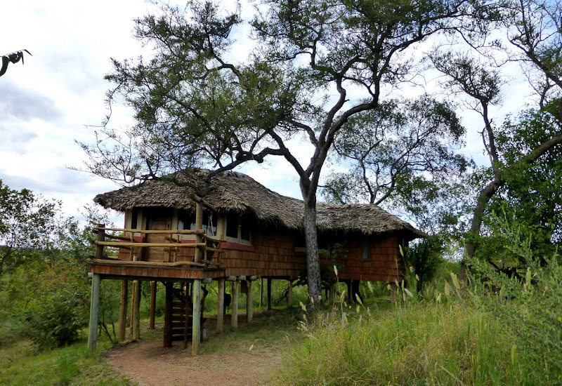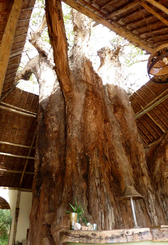 Wir stärken uns mit dem vom Oliver’s Camp zusammengepacktes Lunchpaket, dann geht es weiter zur dritten Besichtigung des Tages. Die Tarangire Treetops Lodge liegt etwas außerhalb des Tarangire Nationalparks. Die Lounge imponiert uns allen sehr, denn der Eingangsbereich ist um einen 750 Jahre alten Baobab-Baum herum gebaut. Der Manager Simon will uns eins der Zimmer zeigen, das in einen Baobab-Baum hinein gebaut ist, aber zu unser aller Verwunderung ist das Zimmer noch nicht bezugsfertig. Auch das zweite Zimmer ist noch nicht vorzeigbar, aber aller guten Dinge sind drei. Wir sind alle von der Qualität ein wenig enttäuscht. Von der Elewana-Gruppe hätten wir etwas mehr erwartet und Svenja war bei einem Besuch 2009 auch voll des Lobes. Nun ja, die neue Saison geht gerade erst los und sicherlich gibt es in der Nebensaison ab und zu auch mal keine Gäste.