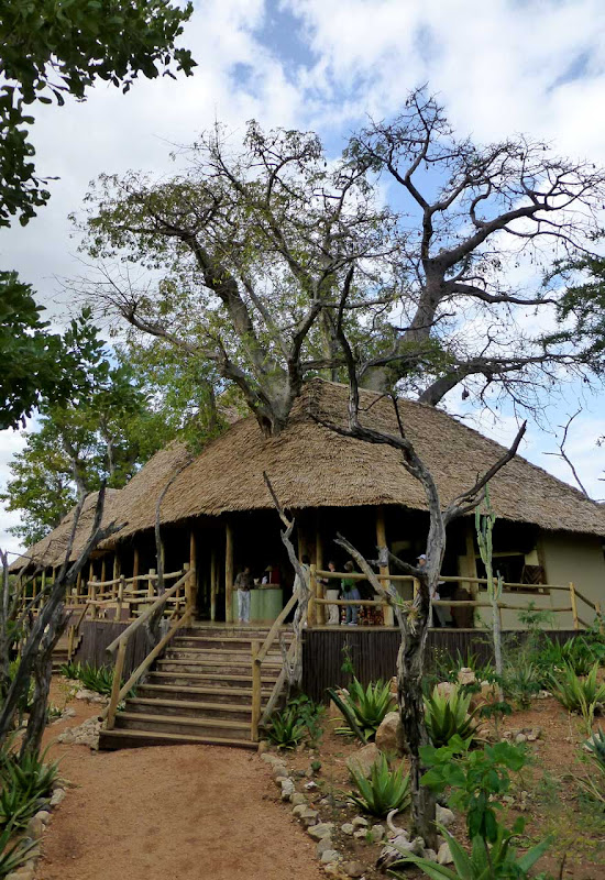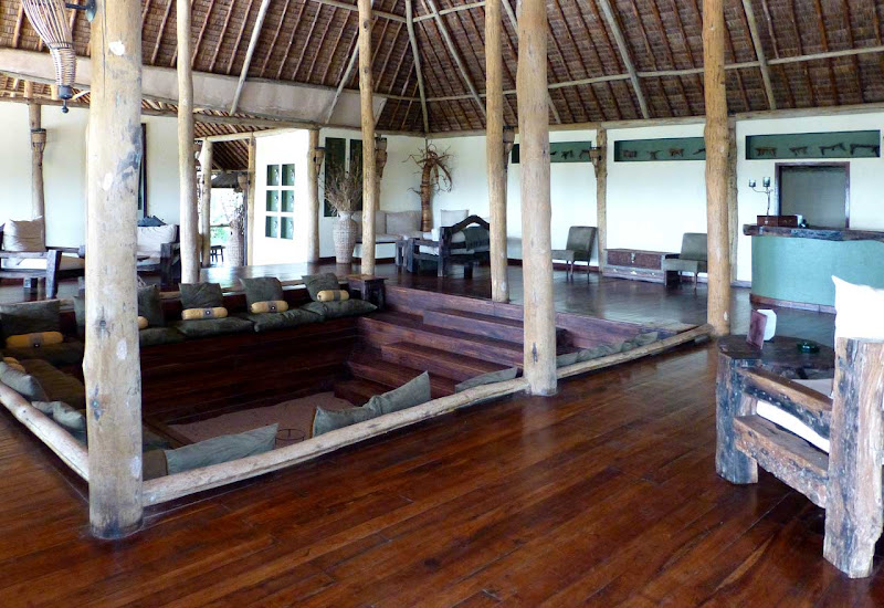 Unterwegs zur nächsten Besichtigung treffen wir noch weitere kleine und große Nationalparkbewohner. Eine Landschildkröte schlurft gemächlich durch den Sand. Zwei große Elefantenmütter mit ihrem Nachwuchs grasen friedlich am Wegesrand. Unser Fahrzeug scheinen sie gar nicht wahrzunehmen. Elefanten sind während der Regenzeit im April/Mai eher seltene Gäste, sie wandern weite Strecken und finden überall Futter. Während der Trockenzeit hingegen trifft man sie häufig an den Wasserlöchern und Flussläufen im zentralen Nationalpark an.Wir erreichen die zweite Lodge an diesem Tag, die Tarangire Sopa Lodge. Wie alle Lodges der Sopa-Gruppe handelt es sich um eine große Lodge mit Hotelcharakter. Wir bieten sie als Unterkunft bei unseren Rundreisen, zum Beispiel bei der Reise "Tansania mit Hotelkomfort" an. Sie wirkt gediegen, mit gemütlichen Sitzecken und einem tollen Ausblick vom Restaurant aus. Vier Zimmer sind jeweils in einem Haus untergebracht, das einer großen Rundhütte nachempfundenen ist. Sopa hat diesen Baustil zum Markenzeichen gemacht, es gibt auch in Ngorongoro und der Massai Mara ähnliche Hotelanlagen. Isiah, der Angestellte, der uns herumführt, erzählt, dass Renovierungsarbeiten im Gange sind, die bis Mitte 2013 andauern sollen. Die Zimmer, die wir besichtigt haben, machen einen ordentlichen Eindruck. Fön, Safe und Adapter sind vorhanden. Regelmäßig werden Kulturabende angeboten. Alles in allem bietet die Lodge solide Mittelklasse und für Rundreisen eine qualitativ gute Übernachtungsmöglichkeit in der Mitte des Tarangire-Nationalparks.
