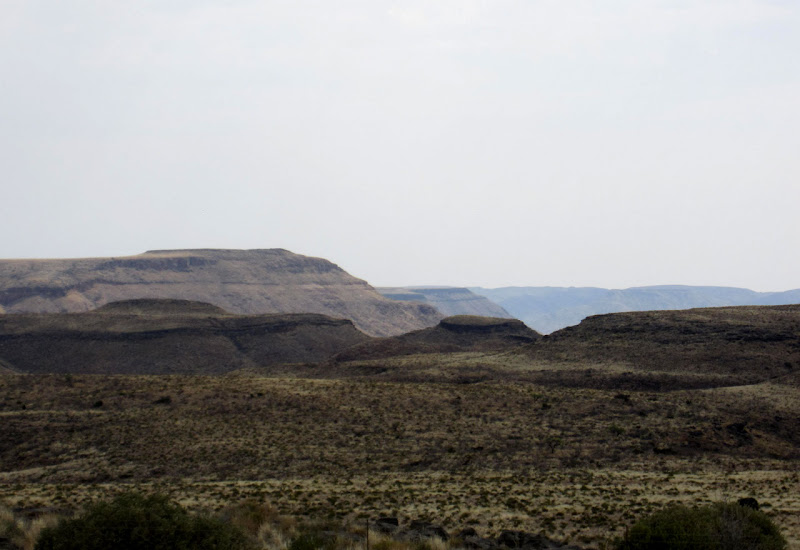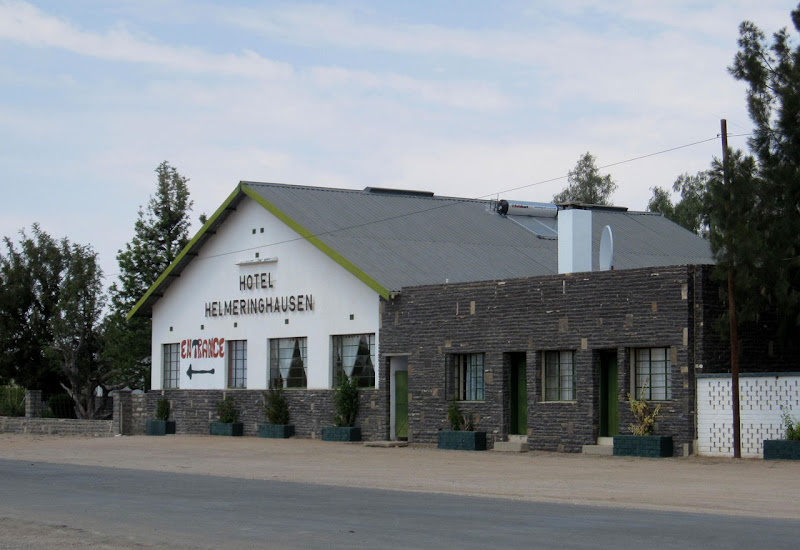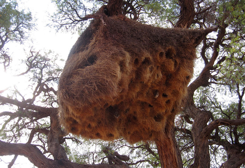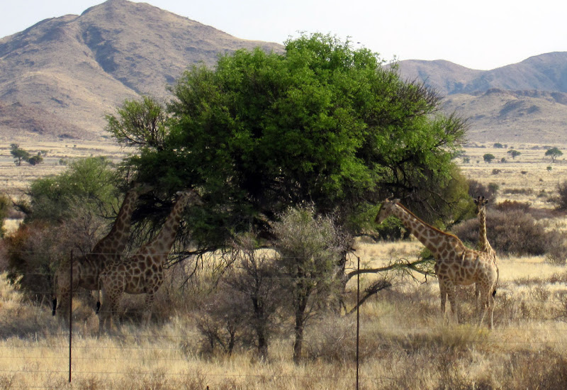 Etwas später kommen wir Helmeringhausen an, wo außer einem Laden und einer Tankstelle noch ein Hotel gibt. Wir brauchen nur eine "Facility" und finden in dem kleinen Dorfladen alles, was wir gerade brauchen - kalte Getränke und ein Eis am Stiel. Auch hier sind die Leute wieder sehr freundlich und die Toiletten sehr sauber.Etwas weiter gibt’s dann Lunch unter einer Kameldornakazie, faszinierende Bäume mit interessanten Früchten. Max warnt uns vor den Dornen, die überall herumliegen. Sie durchbohren glatt die Sohlen von Sandalen. Der Nachmittag schreitet voran, wie kommen unserem heutigen Ziel näher. Unterwegs gibt es immer wieder tolle Panoramen. Nach der vielen Sitzerei beschließen wir, einen kleinen Spaziergang zu machen. Max fährt ein paar hundert Meter vor und wir haben Gelegenheit, in Ruhe Fotos zu machen und uns die Beine zu vertreten. Später halten wir noch an einem riesigen Nest, dass Social Weaver (Webervögel) dort gebaut haben. Die Nester beherbergen mehrere hundert Vögel und können so schwer werden, dass der Ast abbricht. Als Höhepunkt des Tages sehen wir vier Giraffen, die genüsslich an einem Baum herumknabbern und sich nicht stören lassen. Das Gelände ist leider eingezäunt und für eine Nahaufnahme ist der Zoom unserer Kameras nicht stark genug. Trotzdem sind wir alle schwer begeistert, denn bisher waren nur Springböcke und Strauße zu sehen.