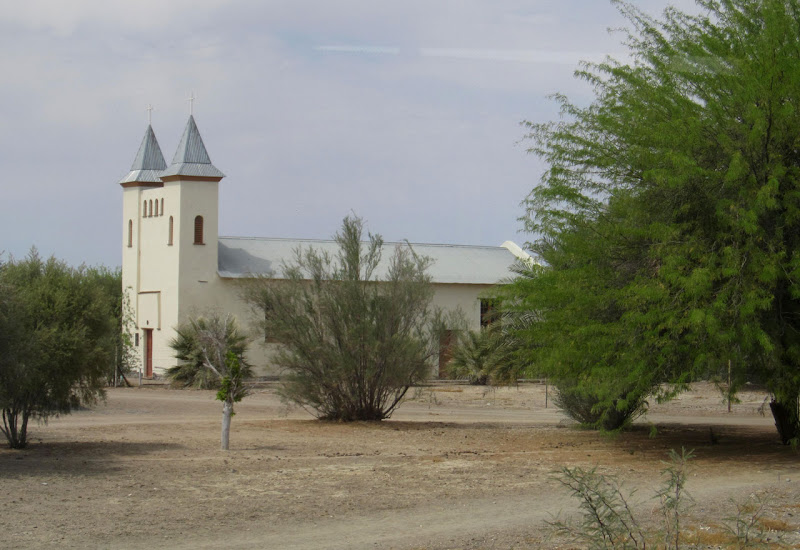 07. Oktober 2012Heute morgen wäre es uns beinahe passiert und wir hätten eine der sieben Todsünden des Safarireisenden begangen - mein Handy hat uns nicht geweckt. Warum, sollte ich erst heute Abend herausfinden.Das Frühstück nehmen wir in der nahegelegenen Lodge ein, und es ist wirklich sehr lecker und reichlich. Dann geht es auf die 600 Kilometer lange Fahrt in Richtung Sossusvlei. Unterwegs machen wir einen Stopp am „Roadhouse“, einem urigen Hotel, dessen Rezeption und der Speisesaal voller Oldtimer und historischer Lastwagen sind. Auf dem Außengelände rosten Karosserien malerisch vor sich hin, eingewachsen und umrankt von Bäumen und Pflanzen. Wir haben die letzte Sitzreihe gewählt, weil man da bequemer sitzen kann, und finden uns als lustiges Quartett mit Sandra und Tanja wieder. Später bekommt die Reihe die Bezeichnung "Hühnerstange".Heute ist Sonntag, wie man uns mitteilt. Wir haben selbst schon jegliches Zeitgefühl verloren. Passend zum Wochentag fahren wir durch einen kleinen Ort namens Bethanie und bekommen von Max den Auftrag, die Kirchen zu zählen. Ich komme auf elf. Das sind für die Größe des Ortes mindestens zehn zu viel, zumal man niemanden auf der Straße sieht. Max erklärt uns, dass hier früher eine Art Missionsstation war, und die meisten Kirchen aus dieser Zeit stammen. 1883 wurde hier der erste Landerwerbsvertrag zwischen Heinrich Vogelsang und Joseph Frederiks II für Adolf Lüderitz abgeschlossen, der den Grundstein für die Kolonialisierung legte. Heute leben hier knapp 9000 Menschen - die meisten jedoch im Umland und kaum jemand hat Lust, den Sonntagvormittag in der Kirche zu verbringen, wenn man auf der Farm zu tun hat.