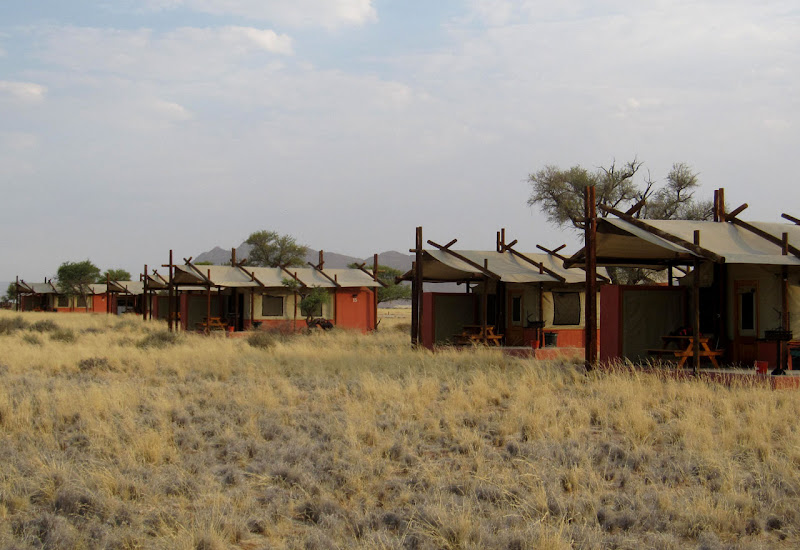 Unsere Unterkunft heute ist das Desert Camp, ein Tented Camp mit tollen Zeltchalets inmitten der savannenähnlichen Graswüste. Es weht ein starker Wind und wir nutzen unsere Chance, große Wäsche zu machen. Nach einer Stunde ist bereits alles wieder trocken. Trocken ist auch unsere Kehle und wir holen uns Drinks an der Bar. Die günstigen Preise sind echt unglaublich - vor allem Bier und Gin & Tonic. Hier trinke ich auch das erste Mal ein "Rock Shandy" und werde süchtig.Zum Abendessen gibt es Lammsteaks vom Grill mit Butternusskürbis und Kartoffeln, außerdem eine salbungsvolle Rede von Max zum Thema „Communication“, die total überflüssig ist. Was soll's, nach einem weitere G&T ist auch das vergessen, und wir machen uns etwas angesäuselt auf den Weg durch die Dunkelheit zu unserem Zelt. Der Wind hat sich gelegt und es herrscht eine unglaubliche Stille über der Wüste, nur unterbrochen vom einem gelegentlichen Zirpen, dass von Geckos stammt.Nach einigen Versuchen löse ich auch das Rätsel um das Handy: Es hat einen Wochentagsmodus, weckt also nur Montag bis Freitag, wenn man nicht etwas anderes einstellt. Und heute war ja Sonntag!