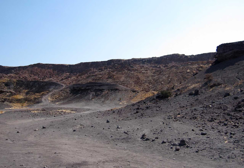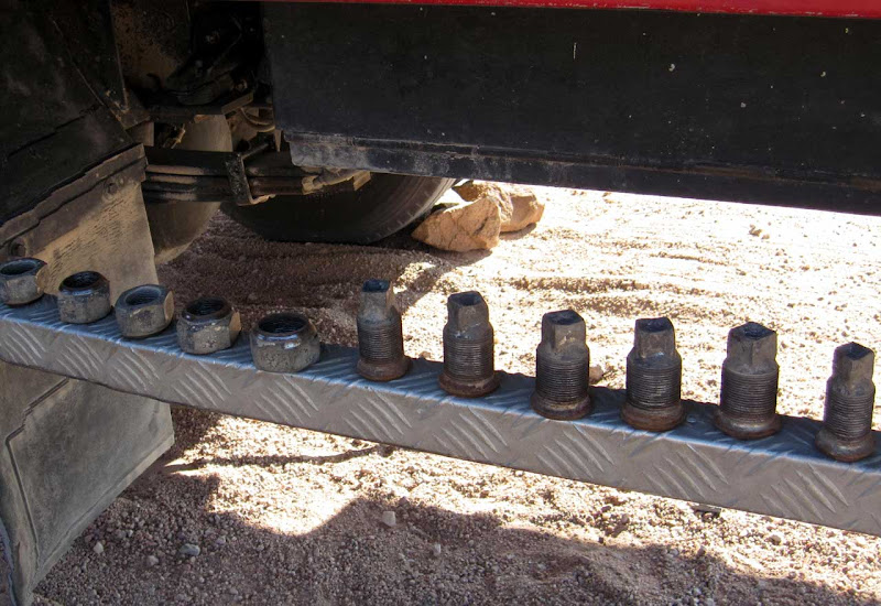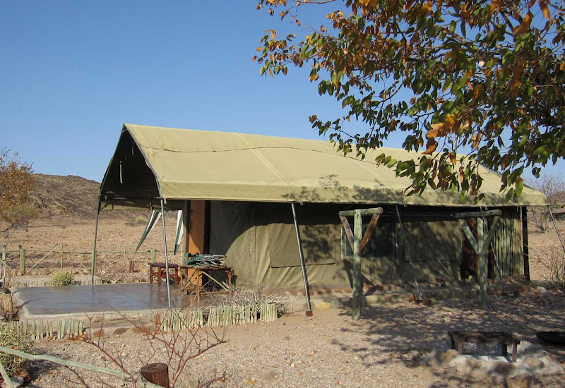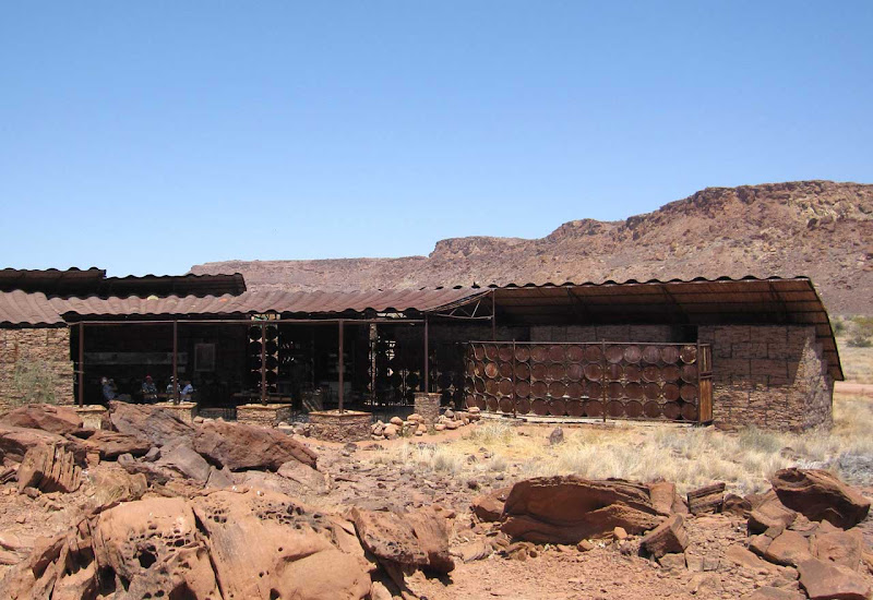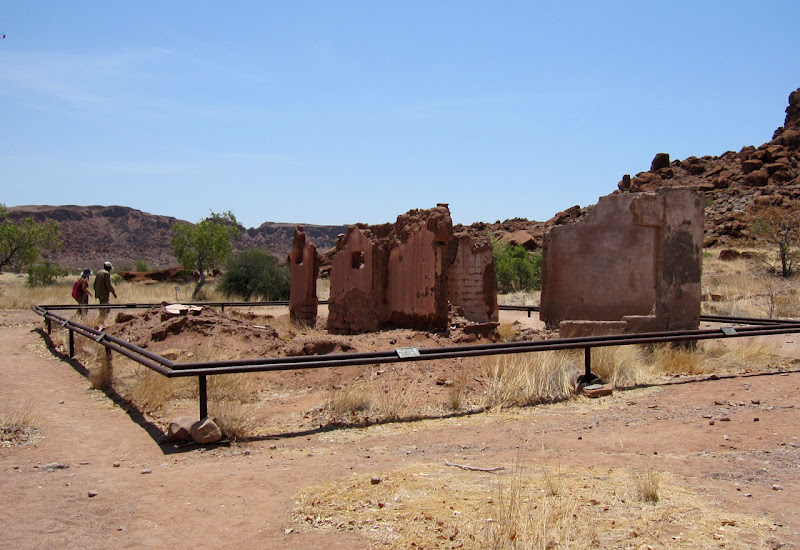 12. Oktober 2012 Tanja und ich haben ein Morgenritual entwickelt. Beim frühen Packen der Taschen singen wir John Denvers Countrysong Leaving on a Jet plane: All my bags are packed, I'm ready to go, I'm standing here outside the lawn ... Das macht es leichter. Ich habe schlecht geschlafen, es war warm und stickig im Zimmer. Nach dem Packen bleibt bis zum Frühstück noch kurz Zeit, das Gelände der Lodge beim ersten Tageslicht anzusehen. Ich entdecke, dass es mehrere Bungalow-Zeilen gibt, die weit verstreut um die Hauptlodge gebaut sind. Nun löst sich auch das Rätsel, warum das Wasser mal kalt und mal glühend heiß ist. Hinter den Bungalowreihen werden große Kessel mit Holz angeheizt. Man fragt sich, warum bei der Sonnenintensität das Heißwasser nicht mit Solarzellen erzeugt werden kann. Vermutlich wollen die Lodgebetreiber nicht in die teure Technik investieren, so lange es Arbeitskräfte und Holz gibt.Auf dem sandigen Weg finden sich Pfotenabdrücke einer Raubkatze. Ein Leopard vielleicht, für Löwenpfoten sind sie zu klein. Es soll hier auch Elefanten geben. Der Anblick des rotglühenden Brandbergmassivs lässt mich das Frühstück fast vergessen- einfach grandios. Nach dem Frühstück geht es weiter in Richtung Twyfelfontein. Max hält an einem „Elephant-Crossing“- Schild. Beim routinemäßigen Check bemerkt Jonathan, dass einer der hinteren inneren Reifen platt ist und das ganze Gewicht nun auf dem Außenreifen lastet. Wir wechseln also den Reifen auf afrikanische Art – zwei arbeiten und elf schauen zu und geben Kommentare. Max hat Routine und gibt profimäßige Anweisungen. Nach einer halben Stunde ist unser Gefährt wieder flott. Ein Wunder, dass die Reifen bei den schlechten Straßen nicht häufiger platt sind.
