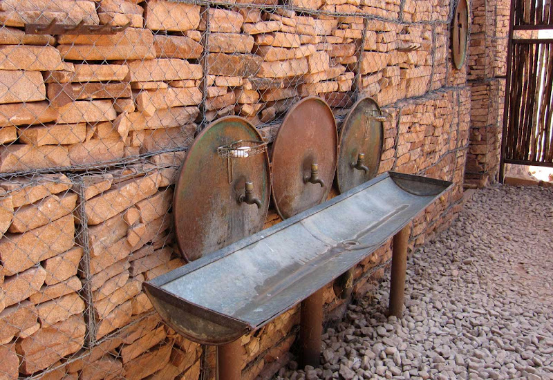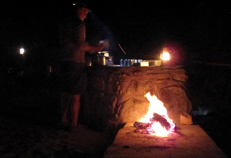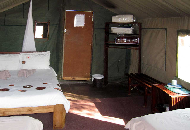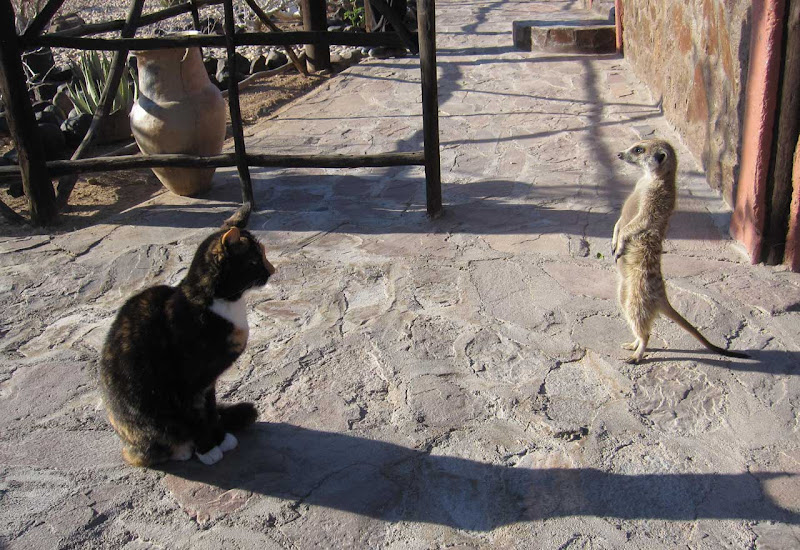 Dann geht es in die Xaragu-Lodge. Der Name bedeutet Erdmännchen. Die Lodge hat sogar ein zahmes zwei Monate altes Erdmännchen, das zur Freude der Gäste sehr zutraulich ist und sich auch gern fotografieren lässt. Den zahlreichen Katzen ist das possierliche Tierchen jedoch eher suspekt.Unsere Unterkünfte sind Zeltlodges mit offenem Badezimmer. Bei der Vergabe der Schlüssel haben wir Glück und erhalten ein großes Familienzelt mit vier Betten und richtig viel Platz. Im Garten steht auch ein Wäscheständer, den wir erst einmal vollpacken. Es gibt leider keinen Strom in den Zelten, so dass wir die Akkus nur im Restaurant aufladen können. Als es dunkel wird, kommt ein Angestellter, um die Petroleumlaternen anzuzünden. Sie werfen ein romantisches Licht und auch das Lagerfeuer brennt bereits gemütlich, als wir uns zum Abendessen einfinden. Jonathan hat eine Vorliebe für deutsche Küche und serviert heute Abend riesige Schnitzel mit Mashed Potatoes und einem interessanten Gemüse, bestehend aus verschiedenen Kürbis- und Zucchiniarten.