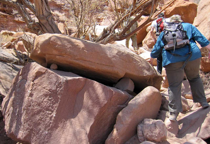 Mit einiger Verspätung erreichen wir Twyfelfontein. Die Sonne steht hoch am Himmel und wir werfen kaum einen Schatten. Der Führer, wieder ein älterer Damara-Mann, ist überraschend witzig und klärt uns auf, dass die Ottifanten eigentlich nur eine billige Kopie einer Felsgravur von hier sind. Woher er Otto Waalkes kennt und wie oft er diesen Witz bereits erzählt hat, verrät er nicht. Von den Felsgravuren gibt es Tausende auf dem Gelände. Warum sie entstanden sind, kann niemand genau sagen. Sie könnten eine Art Inventarliste sein oder eventuell auch die Pfade der Tiere beschreiben, vielleicht auch die Speisekarte eines Steinzeit-Restaurants. Auf jeden Fall sind sie sehr faszinierend. Twyfelfontain heißt übersetzt "Zweifelhafte Quelle", denn die früheren Bewohner konnten sich nicht auf einen stetigen Wasserfluss verlassen.