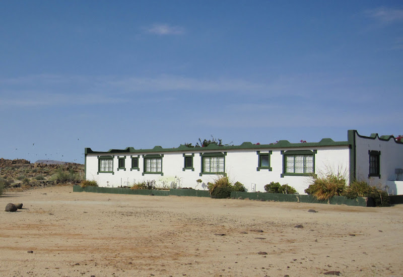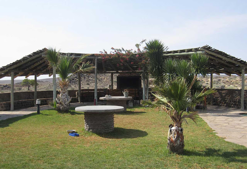 Nach einer Weile biegt Max auf eine unebene Piste ab, und wir erreichen eine Lodge, die nicht von dieser Welt ist. Mitten in den Steinbergen ist hier ein grüner Rasen, es wachsen hohe Kakteen, und sogar Stiefmütterchen sind angepflanzt. Am Haus rankt eine riesige Bougainvillea. Fast meint man, an einem Filmset zu sein, das hier mitten in der Wüste errichtet wurde. Unser eigentliches Camp liegt vier Kilometer entfernt und entpuppt sich als herrliches, fast mexikanisch anmutendes Pueblo mit hübschen Räumen und einem schattigen Innenhof, in dem noch mehr Bougainvilleen wachsen.