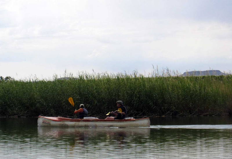 06. Oktober 2012Heute Morgen starten wir ganz entspannt in den Tag - wir genießen den Sonnenaufgang über dem Fluss mit einer Tasse Kaffee im Bett, bevor wir uns fertig machen. Um acht Uhr gibt es Frühstück, danach werden Christine, Hannes und ich zur Bootstour abgeholt. Wir bekommen Schwimmwesten und fahren auf der Ladefläche eines Trucks stehend in Richtung Grenze zurück. An einer seichten Stelle werden unsere Kanus zu Wasser gelassen und es geht los. Stevie, der Guide, sitzt hinter mir im Boot, und wir kommen schnell in den gleichen Ruderrhythmus. Er hat mir versichert, dass wir nicht kentern werden. Als ich ihn frage, warum er da so sicher ist, sagt er nur: "Ich kann nicht schwimmen".