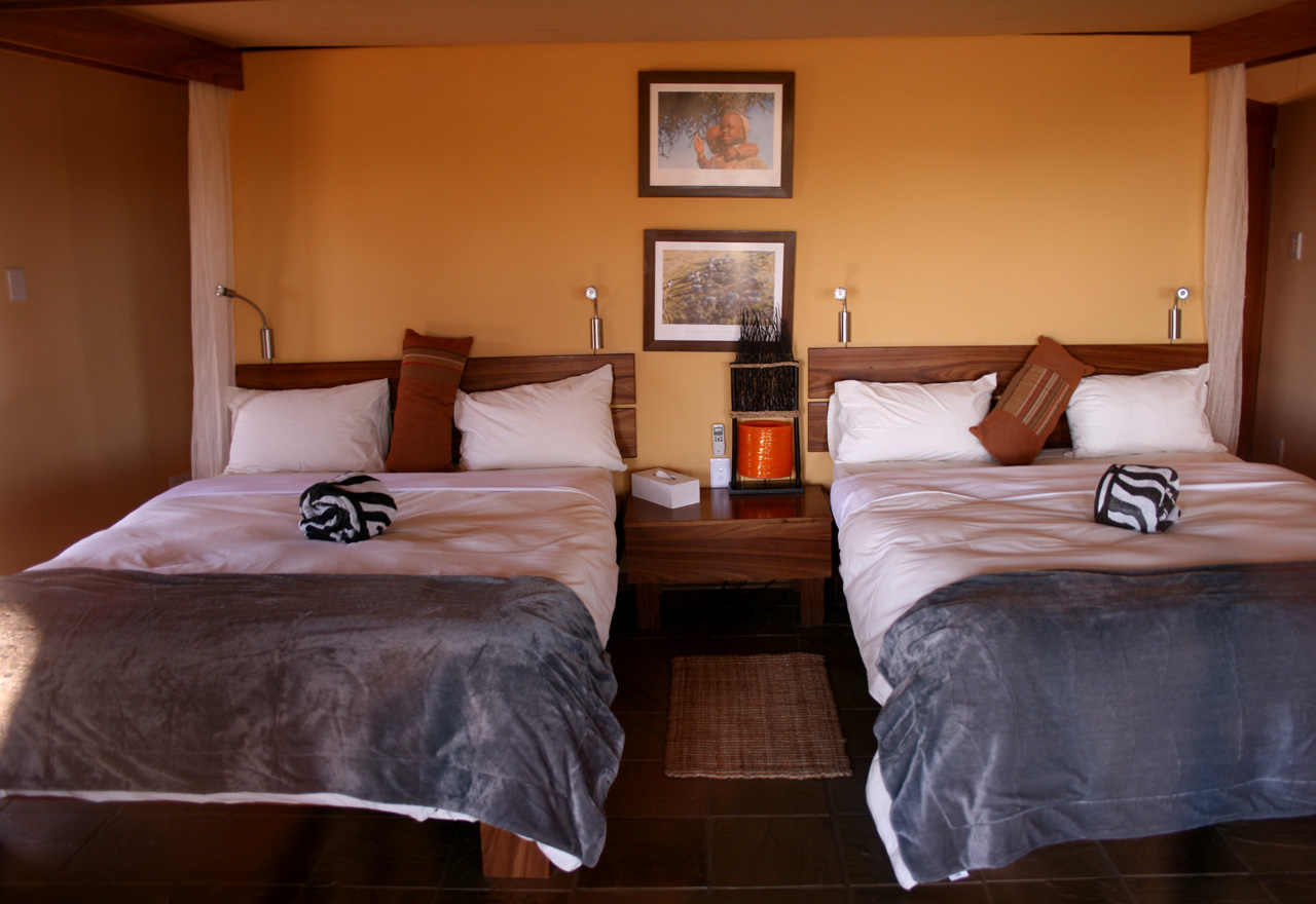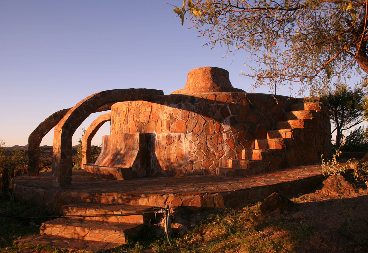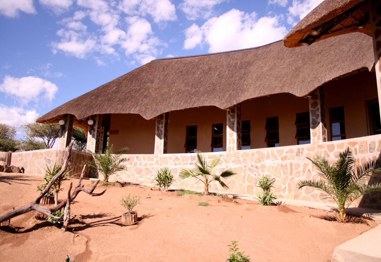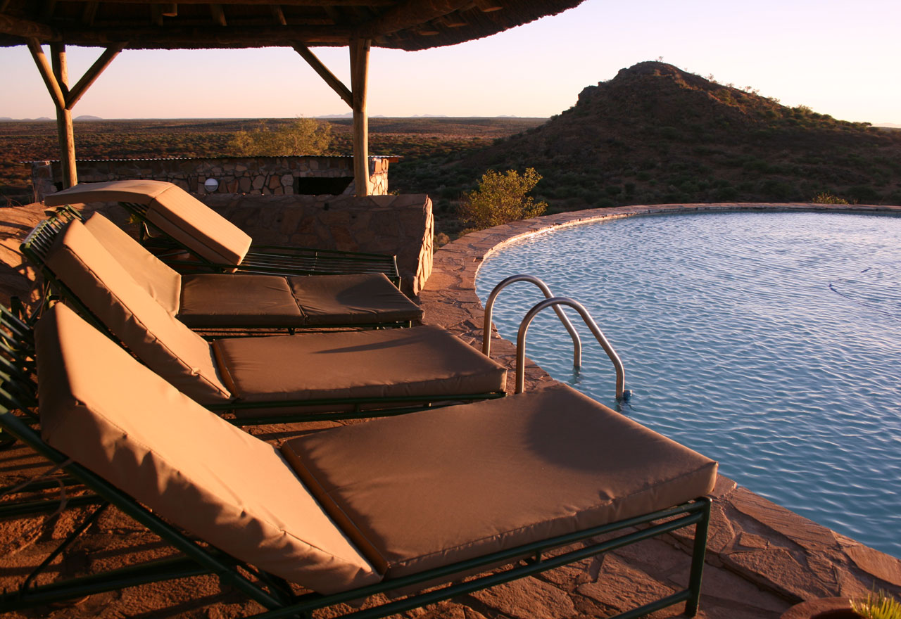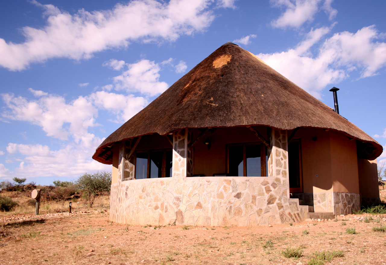 Die Onjala Lodge ist nordöstlich von Windhoek auf einer Erhebung mitten in der Wildnis gelegen. Die schönste Sicht hat man vom großen Pool und der Aussichtsplattform. Es ist von hier möglich, ein einhundertachtzig Grad-Panoramabild und den tollen Sonnenuntergang zu fotografieren. Auch von den Zimmerterrassen haben die Gäste einen schönen Blick in die Landschaft und von dem Balkon der im ersten Stock gelegenen Zimmer kann man in den Innenhof auf den kleinen Pool schauen. Alles ist mit Natursteinen gebaut. Die Zimmer sind sehr individuell, keines gleicht dem anderen. Die Räume sind offen und sehr hoch. In der oberen Etage gibt es einen Kamin mit Sitzgelegenheiten. Die Bauweise der Lodge passt in diese Gegend. Weitere Unterkünfte stehen etwas abseits des Hauptgebäudes. Es sind Panorama-Luxussuiten im Bungalowstil. Wie der Name es schon verspricht, sind die reetgedeckten, einzeln stehenden Rundhäuser mit viel Liebe zum Detail elegant ausgestattet und gestaltet.