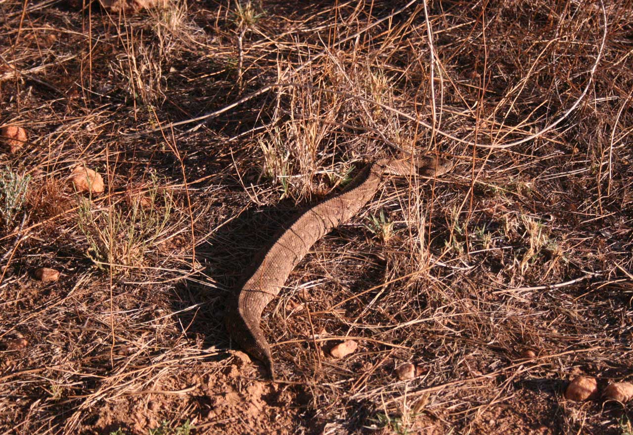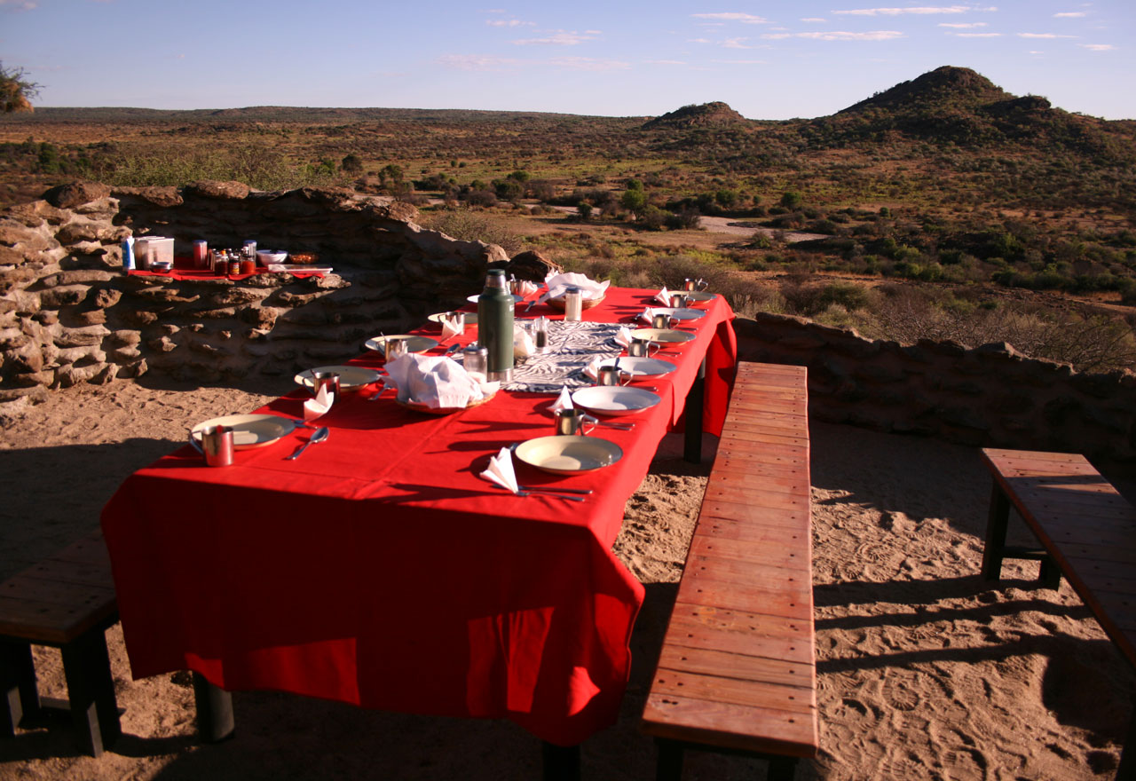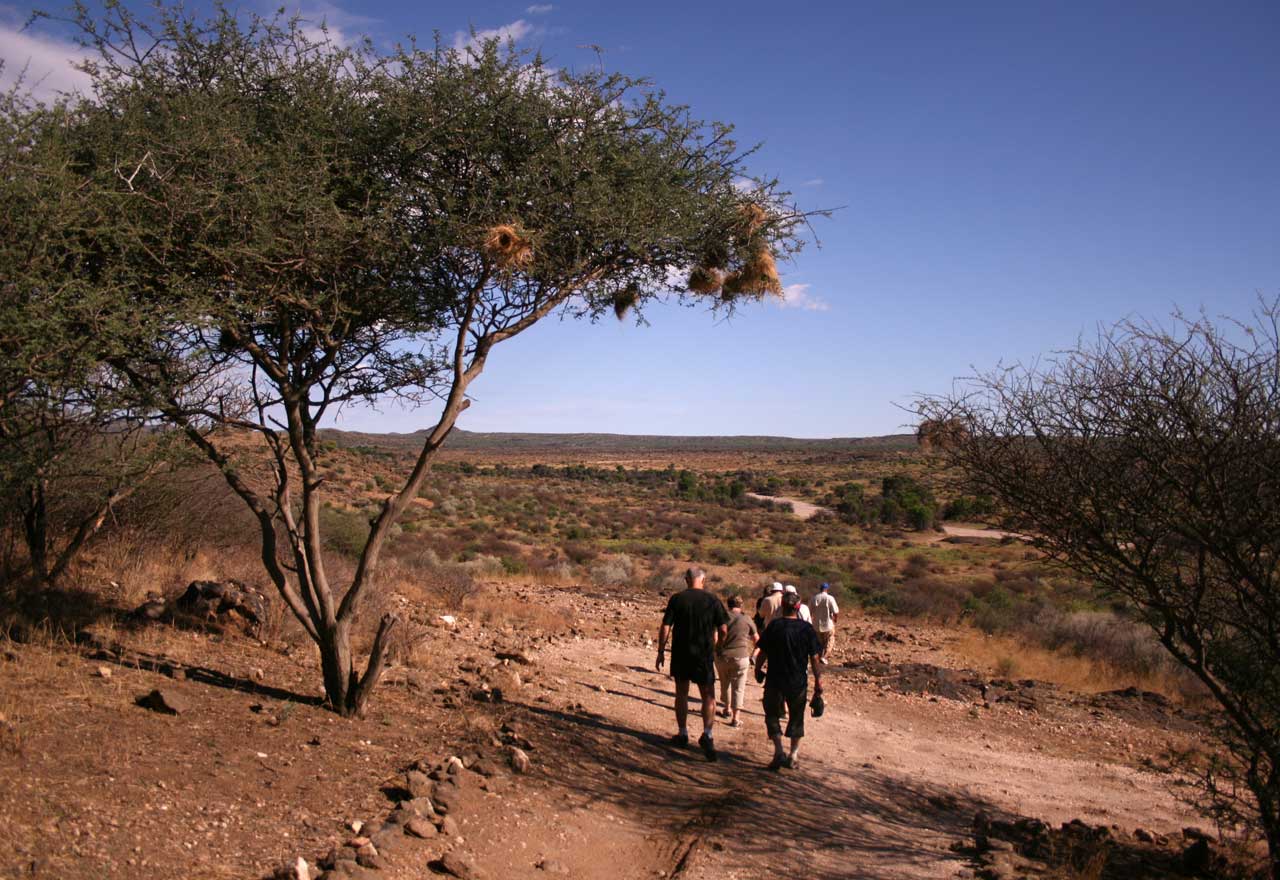 Bevor wir uns Massagen und Entspannung hingeben können, stehen noch zwei Ausflüge auf dem Programm. Peter, ein Guide der Onjala Lodge, führt uns noch vor dem Frühstück auf eine Wanderung durch die Umgebung.Es ist noch angenehm kühl, die Sonne ist gerade erst aufgegangen. Festes Schuhwerk wurde angesagt, dann geht es in Zweierreihe über einen Wanderweg zum nächstgelegenen Berg. Wie immer sind wir viel zu laut, da wir nicht nur schwatzen, sondern auch schon wieder laut lachen. Damit verscheuchen wir natürlich alle Tiere. Nur eine Schlange lässt sich von uns nicht abschrecken, die sind ja auch taub. Die giftige Puffotter liegt genau am Wegesrand. Peter entdeckt sie anhand der Spuren im Sand. Mit ausreichendem Abstand betrachten wir sie und halten Beweisfotos fest. Natürlich schwatzen wir weiter, sind aber etwas aufmerksamer und schauen auf den Boden. Wir wollen ja nicht auf ein giftiges Tier treten. Am Ende unserer Wanderung erwartet uns eine Überraschung: Auf dem Berg ist eine Frühstückstafel für uns gedeckt. Es duftet nach Ei und Speck und diese Aussicht, herrlich!