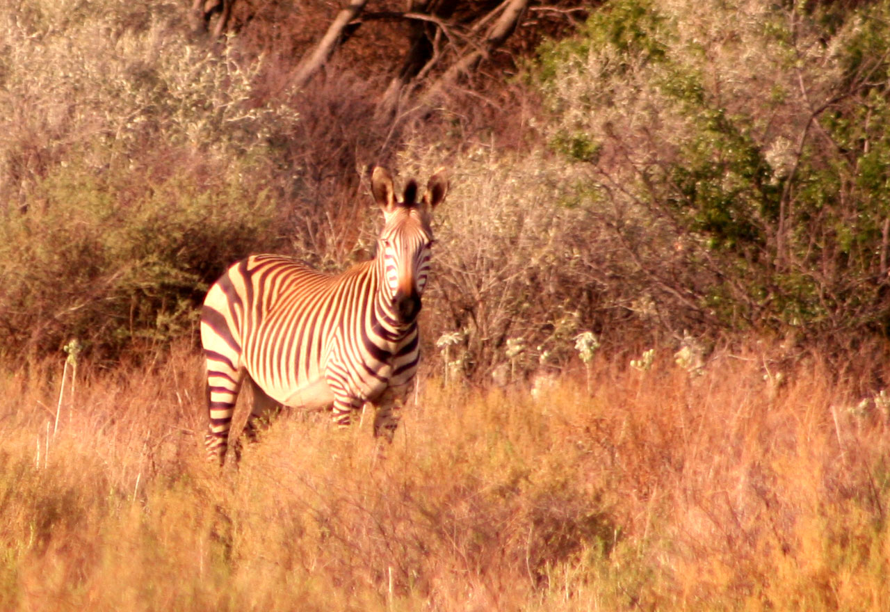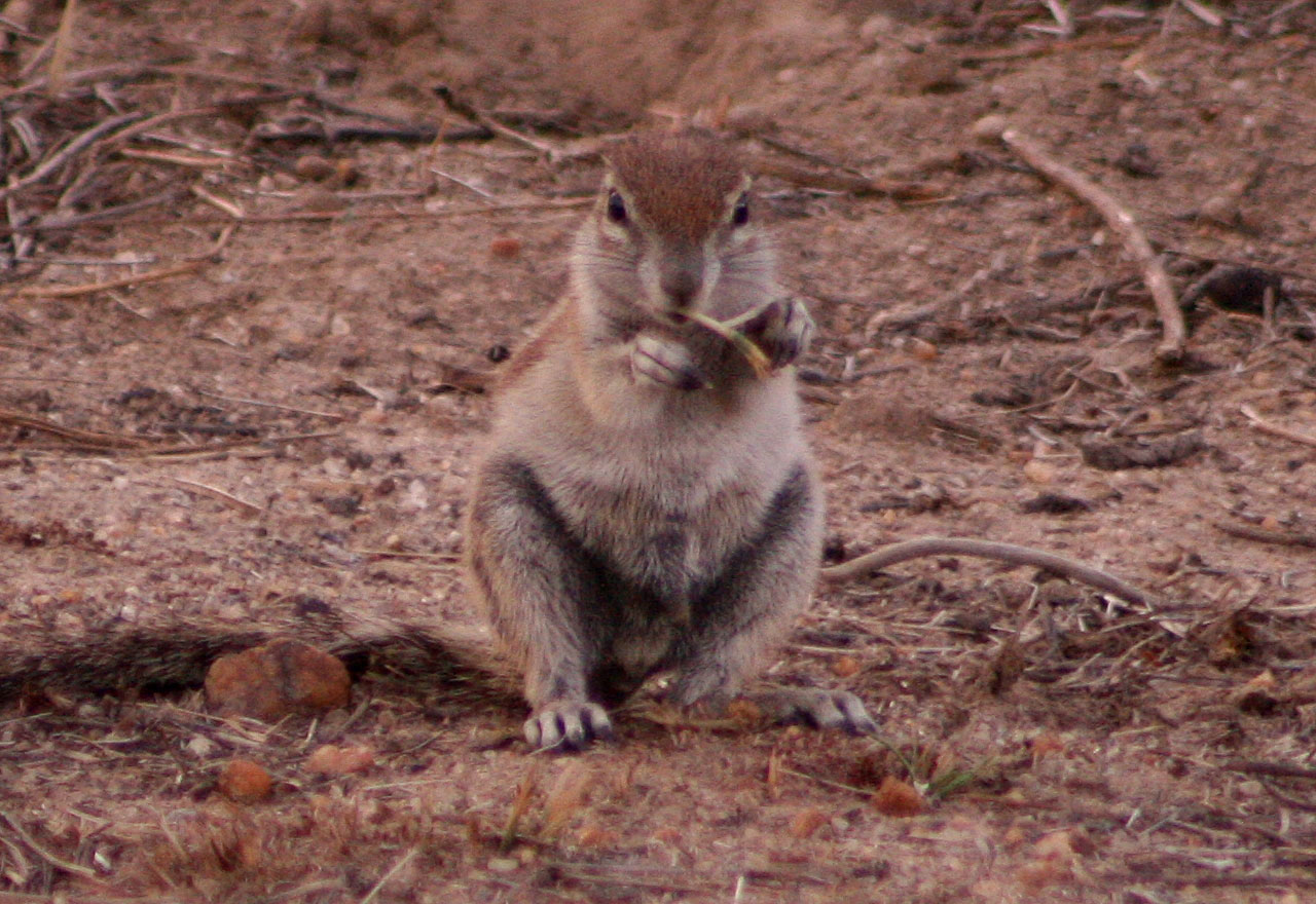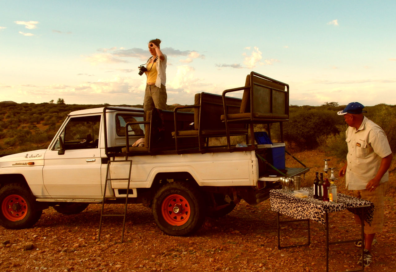 Am späteren Nachmittag sind wir erneut mit Peter unterwegs, diesmal mit einem offenen Geländewagen. Die letzte Pirschfahrt in Namibia. Wir sehen Zebras, Erdhörnchen, Warzenschweine, Impalas und Kudus, sowie die Weißschwanzgnus, die ich bisher noch nie zu Gesicht bekommen hatte. Zwei Stunden kreuzen wir durch die Buschsavanne, dann halten wir auf einer der vielen Gebirgsformationen bei Sonnenuntergang an. Unser Fahrer baut eine kleine Bar auf und bietet verschiedene Getränke für unseren letzten Sundowner an. Wie immer trinken wir Gin&Tonic.