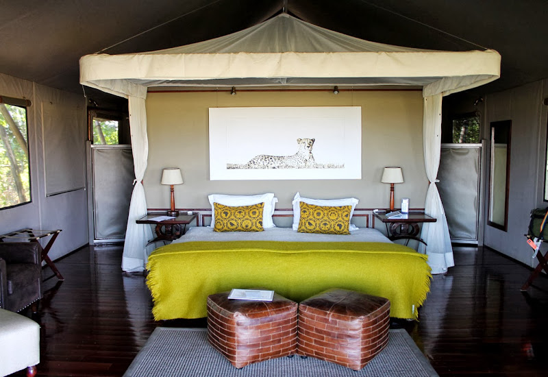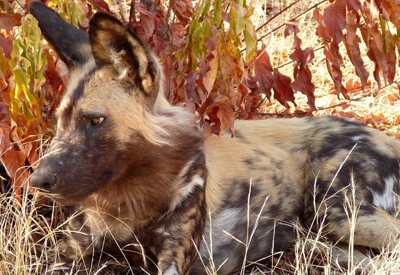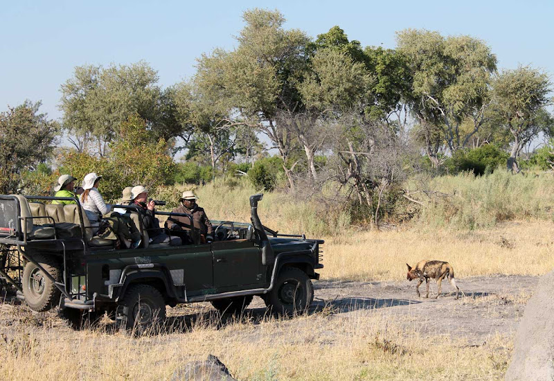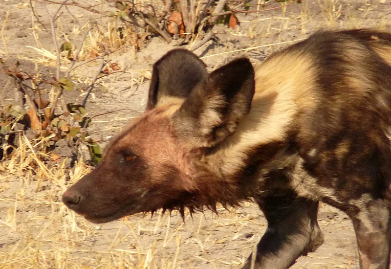 Ich entscheide mich gegen eine Nachmittagspirschfahrt und fahre direkt ins Camp, um endlich einmal meine Notizen aufzuarbeiten. Das Chitabe Camp ist ein Wilderness Classic Camp. Die Zelte sind trotzdem schon ordentlich groß, ich habe ein schönes frisch bezogenes Bett, auf dem ein persönlicher Willkommensgruß liegt. Es gibt einen Safe, eine Außendusche und der Blick von der Veranda über eine Sumpflandschaft ist großartig. Pünktlich zum Abendessen bin ich dann wieder in der Lounge. Hier treffe ich eine Menge Amerikaner. Mit Paul unterhalte ich mich lange und es wird ein richtig netter Abend. Am nächsten Morgen heißt es früh aufstehen, denn ich möchte wenigstens einmal auf Pirschfahrt gehen. Und es lohnt sich!!! Schon zum zweiten Mal auf dieser Reise darf ich Wildhunde beobachten. Es sind vier männliche Tiere, die sich vor unserem Fahrzeug balgen und nachher ausruhen. Was für ein schöner Anblick, wenn ich bedenke, dass diese Spezies vom Aussterben bedroht ist.