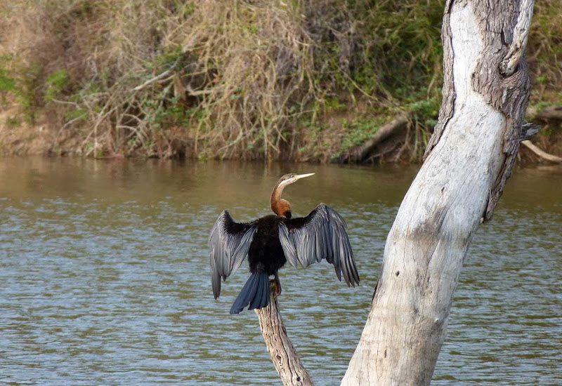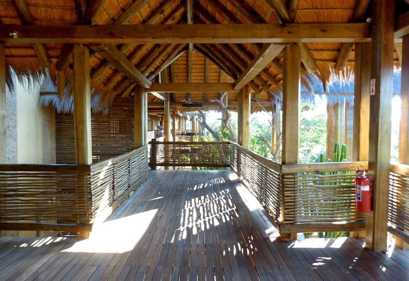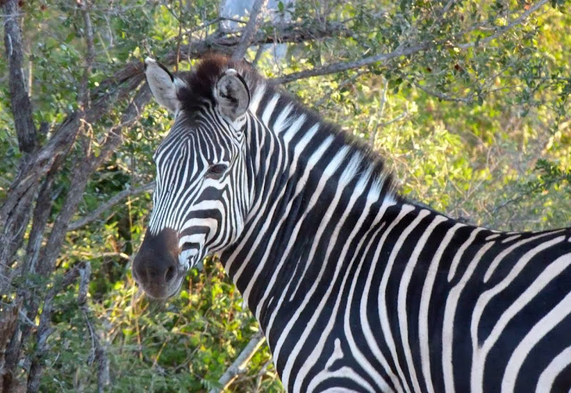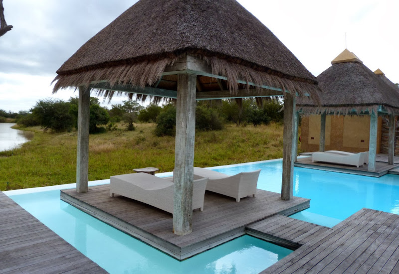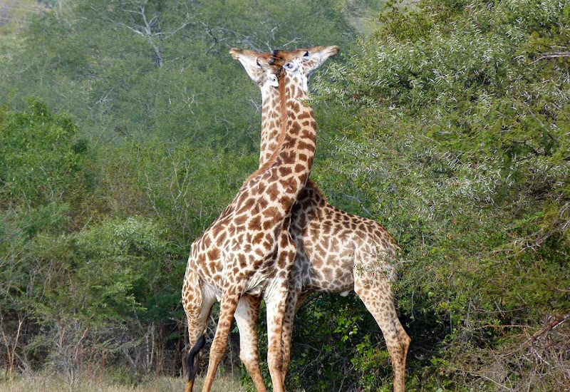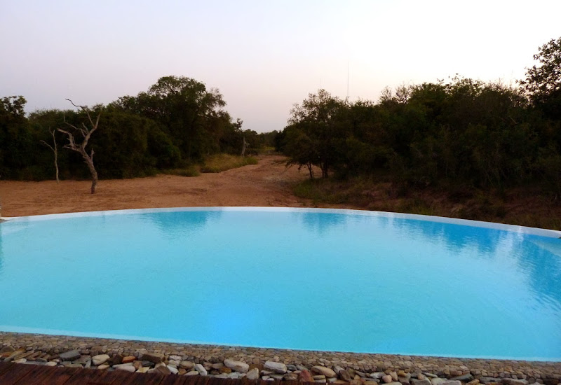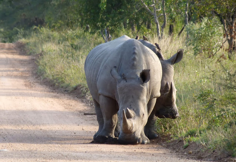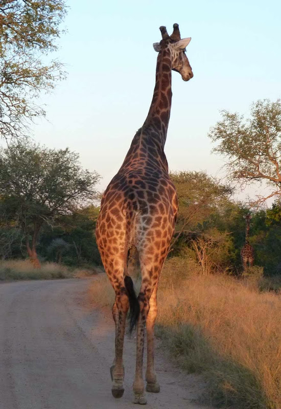 Nach dem Zimmerbezug und einer kleinen Einweisung des Managers Johan begebe ich mich in den riesigen Speisesaal, an dessen Ende sich eine kleine Bühne befindet. Hier finden wohl auch Folklore-Abende statt bzw. findet hier die Band bei Familienfeiern oder größeren Events ihren Platz. Irgendwie werde ich mit dieser Lodge nicht warm. Zu groß, zu unpersönlich trotz aller Bemühungen des Personals, es eben nicht so wirken zu lassen. Wirklich bewusst, in welcher großen Hütte man sich befindet, wird es einem, wenn man sich zur Pirschfahrt auf dem Parkplatz vor der Lodge versammelt. Hier reihen sich unzählige Pirschfahrzeuge im Halbkreis aneinander. Ja, das ist schon ein wenig Massenabfertigung. Umso mehr erstaunt bin ich aber, als wir während der eigentlichen Pirschfahrten nie mehr als drei oder vier andere Autos sehen. Das hat man ganz gut im Griff, es ist ja auch ein großes Reservat. Die wirkliche Stärke der Lodge liegt wohl in der Qualität der Guides und der Tracker. Mein Ranger Stefan, der mir exklusiv für zwei Pirschfahrten zur Verfügung steht, ist ausgezeichnet. Big Five in zwei Tagen? Das scheint in Kapama nicht wirklich ein Problem zu sein. Auf meinen zwei Pirschfahrten habe ich sie bis auf den Leoparden alle vor die Linse bekommen. Am Abend nehmen wir die Verfolgung einer jungen Löwenfamilie auf und folgen ihnen ein paar hundert Meter der Straße entlang: Auf der Pirschfahrt am nächsten Morgen erfährt Stefan via Funk, dass sich ein Leopard im dichten Schilf eines trockenen Flussbettes befinden soll. Er zögert nicht lange und steuert den Toyota Landcruiser mitten hinein in das undurchschaubare Grün. Den Leoparden finden wir leider nicht, dafür bin ich aber um ein unvergessliches Pirschfahrt-Erlebnis reicher:Interessant sind auch zwei kämpfende junge Giraffen, die sich ihre Stärke gegenseitig demonstrieren wollen: http://www.youtube.com/watch?v=8T49SabrMPI. Überhaupt sind Giraffen in Kapama reichlich vertreten und immer wieder schön anzuschauen: Übrigens: Die Ranger berichten regelmäßig von ihren Erlebnissen in einem sehr lesenswerten „Ranger Blog“.