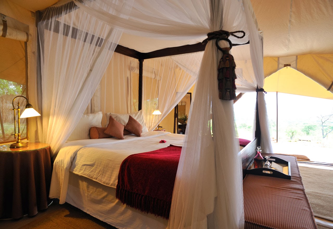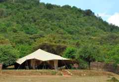 Mit dem Regenschirm bewaffnet, stapfen wir durch das weitläufige Gelände, um uns die elf Chalets anzusehen, die unter weißer Leinwand großzügigen Komfort bieten und mit Antiquitäten möbliert sind. Die Abmessungen des Honeymoon-Tents übertreffen die des Hauptgebäudes in vielen anderen Lodges. An die Zelte schließen sich nach hinten die gemauerten Bdezimmer an. Sie bieten Platz und alles, was man braucht, wirken aber etwas in die Jahre gekommen. In neuen Luxus-Camps legen die Designer viel mehr Gewicht auf die Bäder, platzieren gern freistehende Badewannen und kühn geschwungene Waschtische. Das fehlt im Cottar's Camp. Dafür kann man sich hier jederzeit vom Butler eine traditionelle, ausklappbare Safari-Badewanne richten lassen. Auf Wunsch auch auf der privaten Veranda mit Ausblick ins Loliondo-Gebiet und bis in die Serengeti. Bis zur tansanischen Grenze ist es nicht weit.