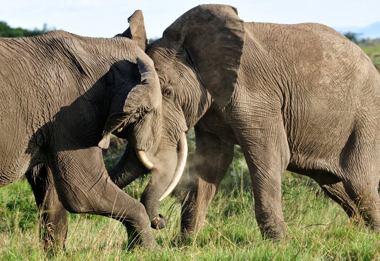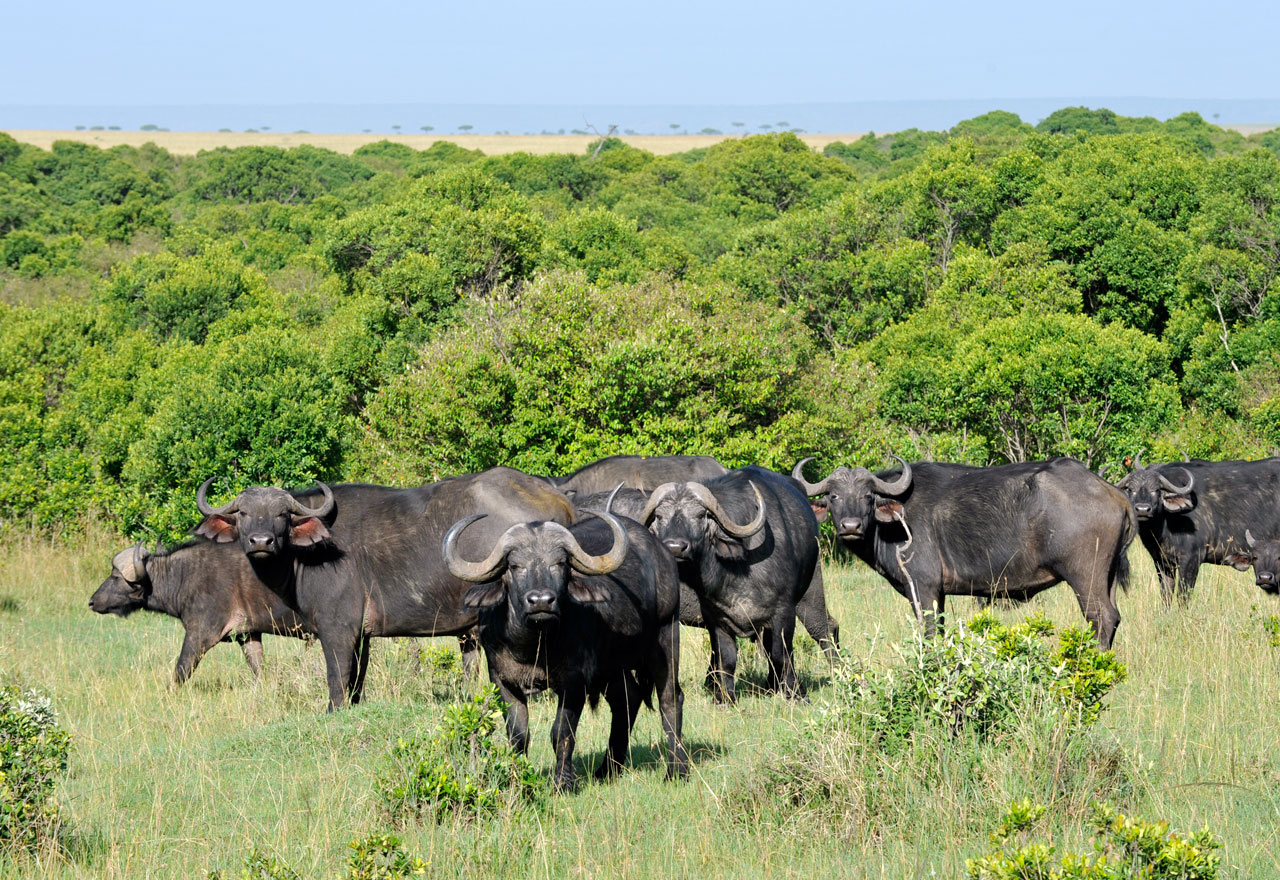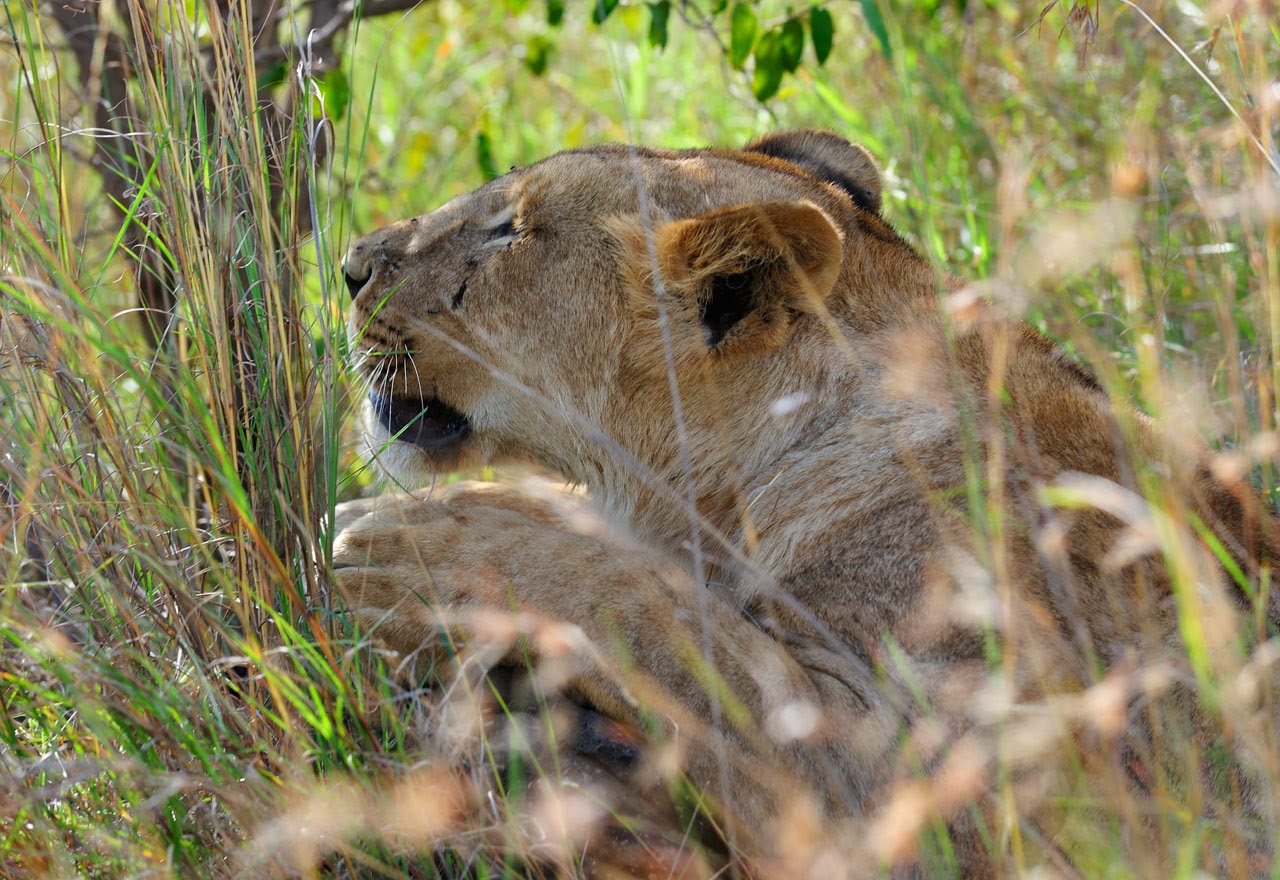 Auf der Pirschfahrt in den offenen Wagen des Elephant Pepper Camps sehen wir eine faule Löwin, die im Gras dahindöst, und zwei streitlustige Elefantenbullen. Dazu wieder Büffel, Zebras und Gnus, die im Gänsemarsch durch die Savanne ziehen. Müssten die Gnuherden jetzt im März nicht viel weiter südlich in der Serengeti sein? Einige von ihnen haben keinen Reisepass und gehen nicht über die Grenze nach Tansania, meint der Guide schmunzelnd. Tatsächlich bleibt ein Teil der Gnuherden das ganze Jahr über in der Massai Mara in Kenia und folgt hier einer eigenen, kleineren Wanderung, der Loita-Migration.