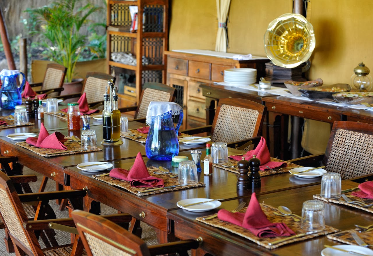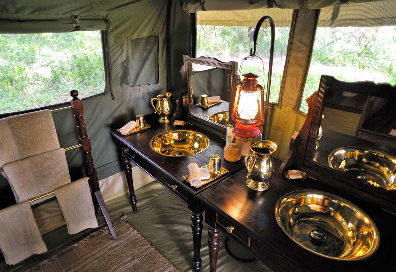 Ich beziehe eines der neun Zeltchalets, die von außen recht schlicht aussehen. Innen sind sie dann aber sehr komfortabel ausgestattet. Besonders die blankpolierten Messing-Waschbecken und Wasserkrüge im Badezimmer erinnern an den Stil alter Safaritage. Auf der Veranda stehen Tisch und Stühle. Am Abend wird das alles von Petroleumlampen stimmungsvoll erleuchtet. Jetzt am Nachmittag lädt eine Hängematte, die zwischen Bäumen neben dem Zelt aufgespannt ist, zum Mittagsschläfchen ein. Meine Nachbarin will das ausprobieren und bittet mich, sie rechtzeitig vor dem Nachmittags-Tee und der Pirschfahrt zu wecken. Gern übernehme ich den "Knock, knock"-Service, nur dass ich keinen Kaffee serviere, wie es die Kellner am frühen Morgen nach dem Weckdienst tun.