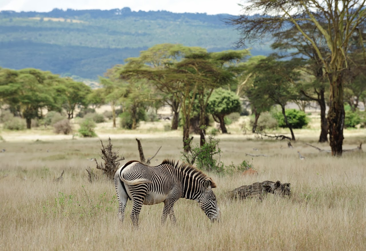 Ein Zebra mit besonders schmalen, sauberen Streifen steht am Wegesrand, als wir von der Landebahn des Lewa Wildschutzgebietes zum Lewa Safari Camp fahren. Das Muster unterscheidet sich von dem der gewöhnlichen Steppenzebras. Die Streifen enden an der Seite des Bauches, die Unterseite bleibt weiß. Es ist ein Grevyzebra, eine besondere Zebraform, der man nur hier in den nördlichen Tierreservaten Kenias begegnen kann und sonst höchstens noch in Äthiopien. Der Hengst trottet allein über die mit goldbraunem Gras bewachsenen Hügel von Lewa, hinter denen der schneebedeckte Felsgipfel des Mt. Kenya durch die Wolken ragt.