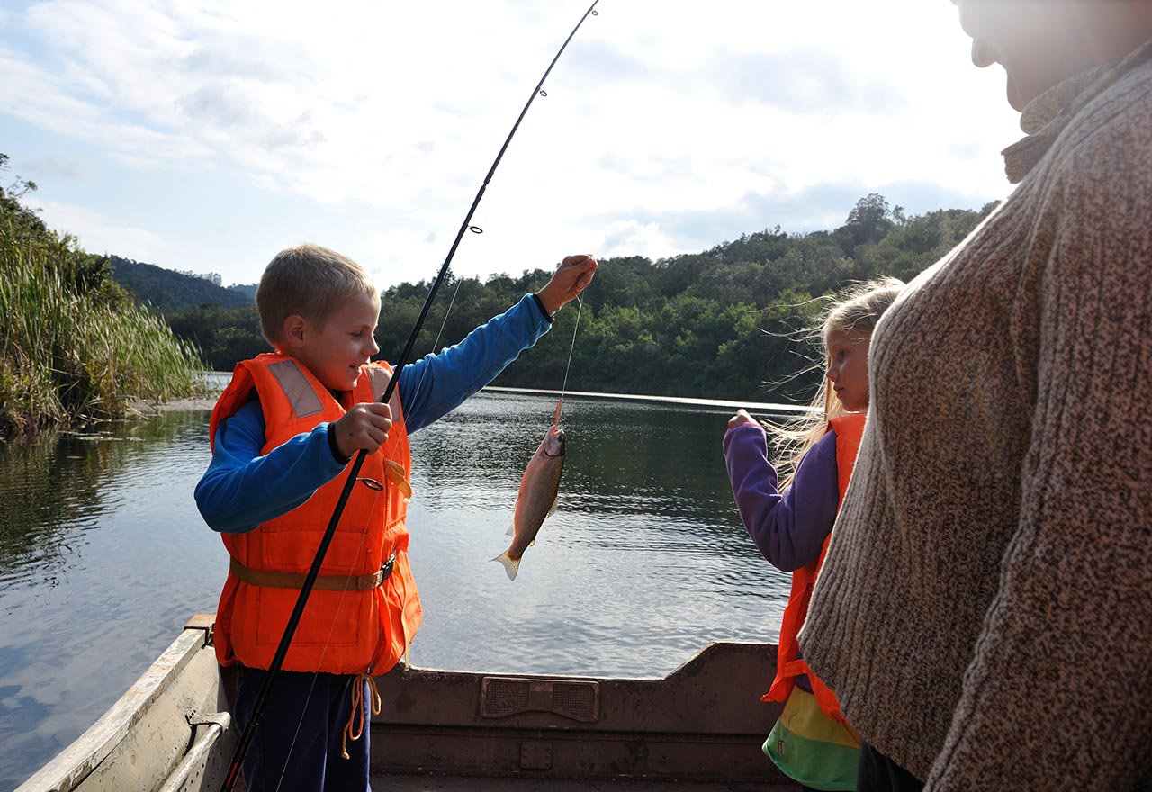 Elise möchte reiten, Simon angeln. Da das Reiten nur vormittags angeboten wird, gehen wir gleich am Ankunftstag auf Fischfang. Mufindi, auch als Fishing Lodge bekannt, hat drei Forellenteiche. Ein kurzer Wanderweg führt von der Lodge durch einen Pinienwald hinunter zum ersten der drei Teiche. Am Ufer liegt ein Boot, Jeanie und James bringen Paddel, Angel und Haken mit. Los geht's. Der sonnige, aber kühle Nachmittag wirkt wie ein schöner Herbsttag. Am Ufer blühen Seerosen in großen Teppichen, es ist friedlich und still. Jeanie hilft Simon, die Angel auszuwerfen. Gar nicht lange, und es zappelt eine Forelle daran. Dann kommt Elise an die Reihe. Während sie geduldig auf ihren ersten Fang wartet, verheddert sich beim Aufwickeln die Leine von Simons Angel. Jeanie und James wollen helfen, und dann passiert es. Eine falsche Bewegung, und der Angelhaken mit dem gemeinen kleinen Widerhaken steckt in Simons Hand.