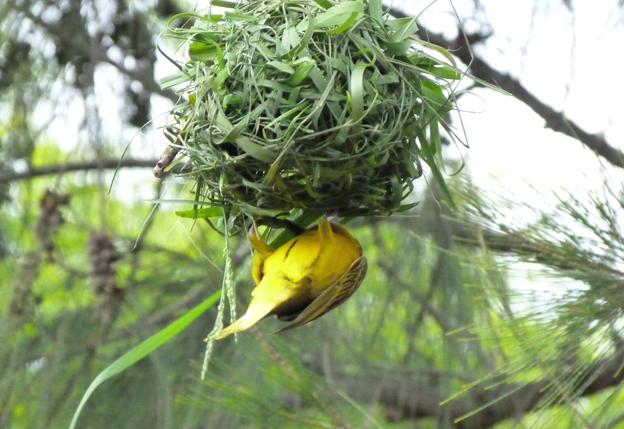 Webervögel, die zur Familie der Sperlingsvögel gehören, sind überall in Afrika anzutreffen. Es gibt zahlreiche Arten in unterschiedlichen Farben von unscheinbarem braun bis gelb, einige sind auch teilweise rot gefärbt. Meist treten sie in Schwärmen auf und legen dabei große Entfernungen zurück. Sie ernähren sich hauptsächlich von Insekten, Samen und Körnern. Der Begriff Webervogel leitet sich von einer einzigartigen Fähigkeit ab. Die Vögel "weben" ihre Nester aus Zweigen und Halmen, die kunstvoll mit Schnabel und Krallen verschlungen werden. Für den Bau sind die Männchen zuständig. Das Weibchen akzeptiert das Männchen nur, wenn es ein perfektes Nest vorweisen kann. Gebrauchte oder zu kleine Nester werden nicht toleriert. Die Männchen bauen deshalb manchmal mehrere Nester zur Auswahl in der Hoffnung, dass eins davon von den Weibchen angenommen wird. Manche Bäume gleichen deshalb einem Weihnachtsbaum mit kugelförmigen Nestern an jedem Ast.