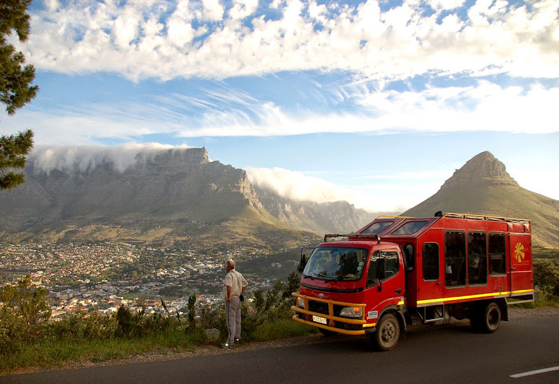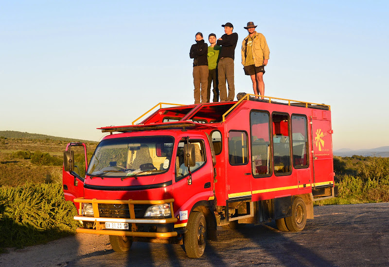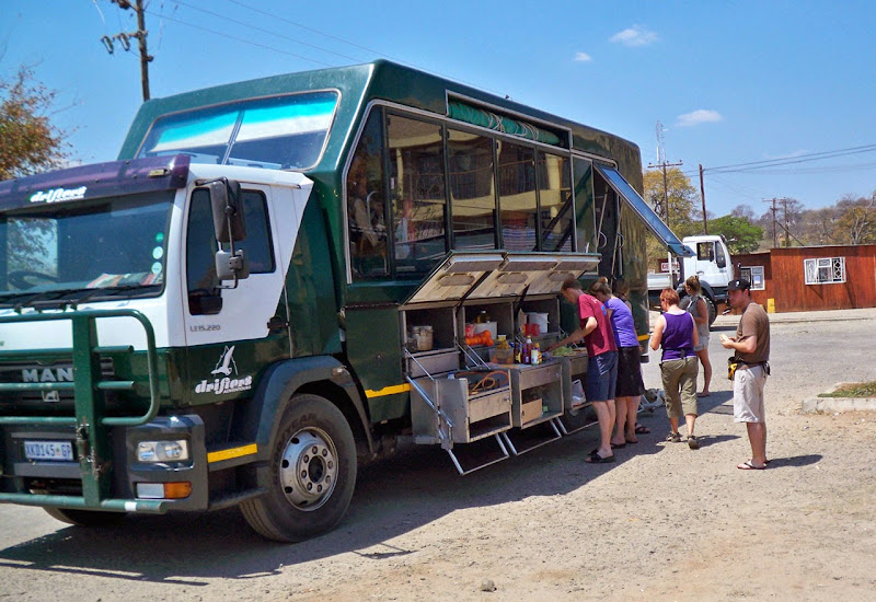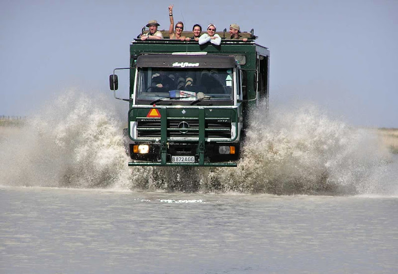 Nun wird der Truck getestet und geprüft, bevor er auf seine erste Tour in die Wildnis gehen kann. Zuvor wird er noch beladen - rund 300 Teile führt ein Safaritruck als Ausrüstung mit sich, angefangen Campingausrüstungen über Kochutensilien bis hin zu einem Kühlschrank, Gaskochern und natürlich Werkzeug und Ersatzteilen. Dabei muss auch noch Platz für das Gepäck der Kunden bleiben und für die Lebensmittel, die besonders bei Touren in abgelegene Gebiete für mehrere Tage mitgeführt werden müssen. Deshalb wird jeder Winkel und jede Nische effektiv ausgenutzt.Rund 80.000 bis 100.000 Kilometer legt ein Truck im Jahr zurück. Für ein Nutzfahrzeug ist das eher durchschnittlich, aber die Mehrzahl der gefahrenen Kilometer führt nicht über gut asphaltierte Straßen, sondern über Schotterpisten und durch unwegsames Gelände. Auch Flüsse müssen gelegentlich durchquert werden. Ersatzreifen gehören deshalb in großer Zahl zur mitgeführten Ausrüstung. Die meisten platten Reifen gibt es erfahrungsgemäß in Namibia, weil dort überwiegend grobe Schotterpisten befahren werden, deren Steine sich gern zwischen den Doppelreifen verklemmen. Sunway hat es in Namibia auf einer Tour einmal auf elf Reifenpannen gebracht, Drifters sogar auf 15 auf einer Botswana-Tour, davon sechs an einem Tag. Die Fahrer ersetzen kaputte Reifen immer sofort in der nächsten erreichbaren Werkstatt. Mittlerweile kommen auch immer mehr schlauchlose Reifen zum Einsatz, die wesentlich unempfindlicher gegen spitze Steine und Geröll sind. Nach vier bis fünf Jahren ist die Karriere des LKW als Safaritruck vorbei, das Chassis dagegen kann runderneuert auf ein neues Fahrzeug wieder aufgesetzt werden.Die Außenhaut ist durch das Fibermaterial resistent gegen Steinschlag und Zweige. Bricht eine Scheibe, so kann diese dank eines Notfensters ersetzt werden. Die Trucks haben vorn stabile Frontschutzbügel (auch Bullenfänger genannt) und hinten eine Metall-Leiter, die im Normalfall das Heck schützt. Während die Stirn eines halbwüchsigen Elefanten deshalb kaum Schaden anrichtet, wenn sie von vorn gegen das Fahrzeug kracht, kann ein wütendes Nashorn mit einer soliden Hornspitze durchaus ein Loch in die Außenhaut des Trucks bohren. Dies geschieht zum Glück aber sehr selten, weil die meisten Tiere Respekt vor den großen Fahrzeugen haben. Nicht so respektvoll sind dagegen kleine Nagetiere wie Ratten, die sich gern einmal imn Motorraum einnisten und sich an den Kabeln zu schaffen machen. In den Fahrgastraum verirren sich selten Tiere. Meist sind es Paviane, die durch ein leichtsinnigerweise offen gelassenes Fenster eindringen und sich auf die Suche nach Essbarem machen. Dabei können sie erheblichen Schaden anrichten.Durch die besondere Konstruktion bietet ein Safaritruck viele Vorteile gegenüber einem normalen Jeep oder Minibus. Die Gäste sitzen höher, und durch die großen Fenster sieht man viel mehr von der Landschaft. Auf Pirschfahrten lassen sich alle Fenster einschließlich der oberen öffnen und man kann gut fotografieren. Im Innenraum ist mehr Beinfreiheit, und auch die Rucksäcke, Proviant und Getränke lassen sich gut erreichen. Je nach Tour reisen 150 bis 600 Gäste pro Jahr mit einem Truck auf den 12 bis 18 Sitzen durch Afrika, manche nur eine Woche, andere fast einen ganzen Monat. Besonders bei Campingtouren dient der Truck auch als rollende Küche mit Arbeitsflächen, Herd und sogar einem Wassertank zum Händewaschen und für einen ersten Abwasch, wenn unterwegs in der Wildnis gepicknickt wird. Ein besonderes Erlebnis ist es, eine Nacht auf dem Dach des Trucks unter Millionen von Sternen zu schlafen.Übrigens fahren nicht nur Männer die großen Trucks. Sowohl bei Drifters als auch bei Sunway gibt es drei weibliche erfahrene Truckfahrerinnen. Unser Kollege René ist 2009 einmal auf einer Tour mit "weiblicher Note" gewesen und fand, dass die starken Ladies den Männern auf jeden Fall das Wasser reichen können. Übrigens sind rund 60 Prozent der mitreisenden Gäste weiblich, und Trucksafaris erfreuen sich von Jung bis Alt großer Beliebtheit. Der Altersdurchschnitt liegt bei 40 Jahren, es sind aber auch schon Kinder und 80-jährige mitgereist. Rückenprobleme und sehr individuelle Reisevorstellungen sollte man jedoch nicht nicht haben, wenn man auf eine Trucksafari gehen möchte.Hier gibt es noch ein schönes Video von Kilroy, einem niederländischen Partner von Drifters, in dem man den Truck sehr gut sehen kann. Die junge Truppe im Video ist, wie oben erwähnt, nicht repräsentativ für den Altersdurchschnitt.Und noch eine lustige Episode zum Schluss: Bei Drifters steckten einmal zwei Trucks für acht Tage im Schlamm von Moremi (Botswana) fest, weil der erste Truck etwas zu sehr "offroad" gefahren ist und der zweite, der zu Hilfe eilen wollte, ebenfalls steckenblieb. Auch die bei den Gästen sehr beliebten "Rivercrossings", wie sie auf den Fotos zu sehen sind, werden nicht mehr gemacht, weil der Schaden an den Fahrzeugen hinterher wesentlich länger anhält als die Begeisterung über das Abenteuer.Also, steigen Sie ein und erleben Sie mit Ihren Mitreisenden ein gemeinsames Abenteuer in einem soliden und zuverlässigen Fahrzeug. Trucksafaris bieten wir mit Start und Ziel in Südafrika, Namibia, Botwana, Simbabwe, Sambia und Kenia-Tansania in Camping- und Lodgevarianten an. Viele der Reisen lassen sich auch kombinieren oder als Teilstücke erleben. Gern beraten wir sie. Folgende Trucksafaris haben wir selbst erlebt:Vielfältiges Südafrika (Doreen im März 2014)Vom Kap nach Windhoek etwas bequemer (Susanne im Oktober 2012)Simbabwe (René im Dezember 2010)Südafrika und Namibia (Jens im März 2010)Afrikas Südosten (René im September 2009)Südafrika und Krüger Park (Jens im November 2008)