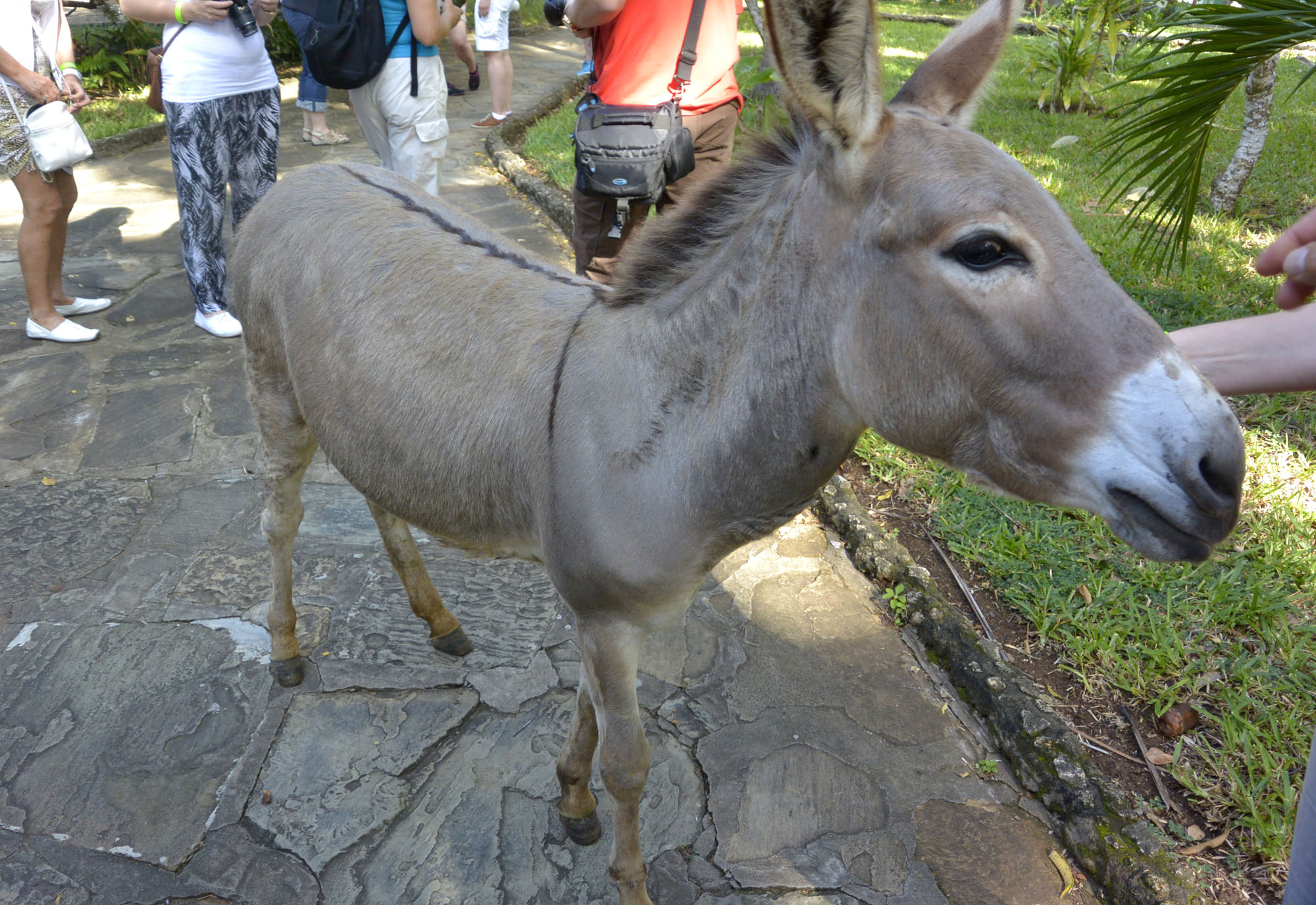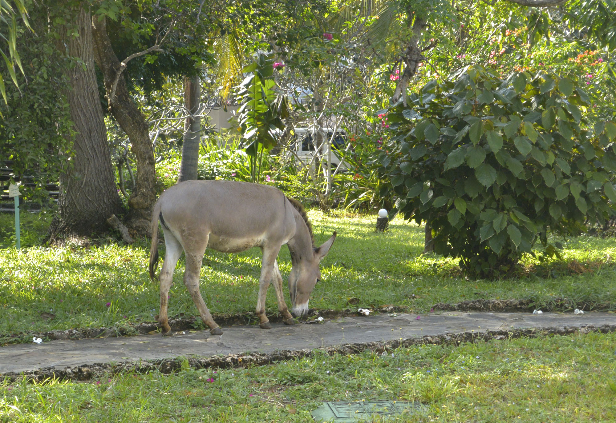 Das gesamte Gelände des Resorts ist mit Bäumen und Büschen bewachsen, überall blühen Hibiskus, Bougainvilleen und Frangipanis. Die Gärtner haben alle Hände voll zu tun. Die Anlage hat ein Fußballfeld, eine Bogenschießanlage, ein Beachvolleyballfeld und eine Tischtennisplatte. In der Nebensaison werden die Anlagen (bis auf das Beachvolleyballfeld) seltener benutzt, in der Hochsaison ist hier mehr Leben. Zwei schöne Pools, der Wellness-Bereich und ein klimatisierter Konferenzraum wirken einladend und gepflegt.Zum Resort gehört auch eine zahme Eselin, der sich frei auf dem Gelände bewegen darf. Wenn Kinder da sind, ist sie voll ausgelastet, denn sie ist der Star der Kinderbetreuung. Da unsere Gruppe und die wenigen weiteren Gäste alle Erwachsene sind, fordert „Philippa“ eben ihre Streicheleinheiten bei uns ein und sorgt für erhebliche Verzögerungen beim Rundgang.