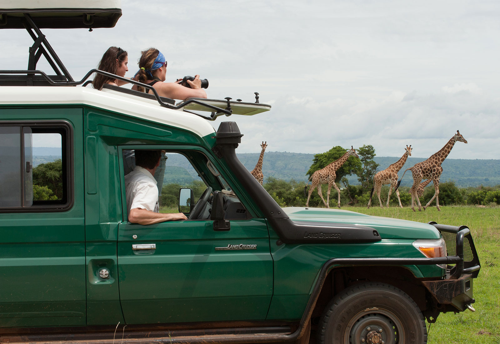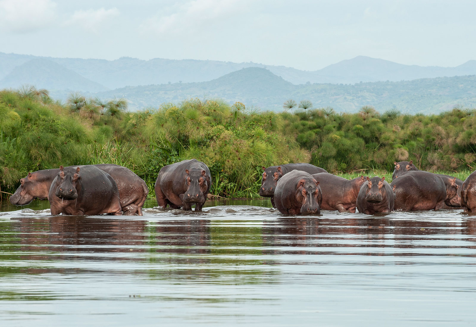 Bald legt unser Boot an. Helmut, unser Reiseleiter, holt uns mit dem Allradwagen ab, und wir unternehmen eine Pirschfahrt durch den Teil des Nationalparks nördlich des Nildeltas. Die Hügellandschaft ist frisch-grün, jetzt im Mai ist Regenzeit in Uganda. In vielen anderen Safarizielen gilt die Regel, dass man in der Trockenzeit die besseren Chancen auf gute Tierbeobachtungen hat. Doch wir können uns hier nicht beschweren, sehen Büffel, Lelwel-Kuhantilopen und unzählige Giraffen. Einmal kommen wir auf mehr als 30 Langhälse bei einer Rundumzählung aus dem offenen Dach des Safariautos. „In der Trockenzeit kann man hier auch Giraffen sehen, aber nicht so viele auf einmal“, erzählt Helmut. Überhaupt seien die Tierbeobachtungen in den ugandischen Nationalparks in der Regenzeit oftmals besser. Hier in Murchison Falls oder auch auf dem Kazinga-Kanal im Queen Elizabeth Nationalpark kann man auch mit dem Boot auf Safari gehen und Tiere vom Wasser aus am Ufer entdecken. Aber die Uferwälder, in die sich das Wild in der Trockenzeit oft zurückzieht, sind oft nicht zugänglich, weil Pirschwege fehlen.