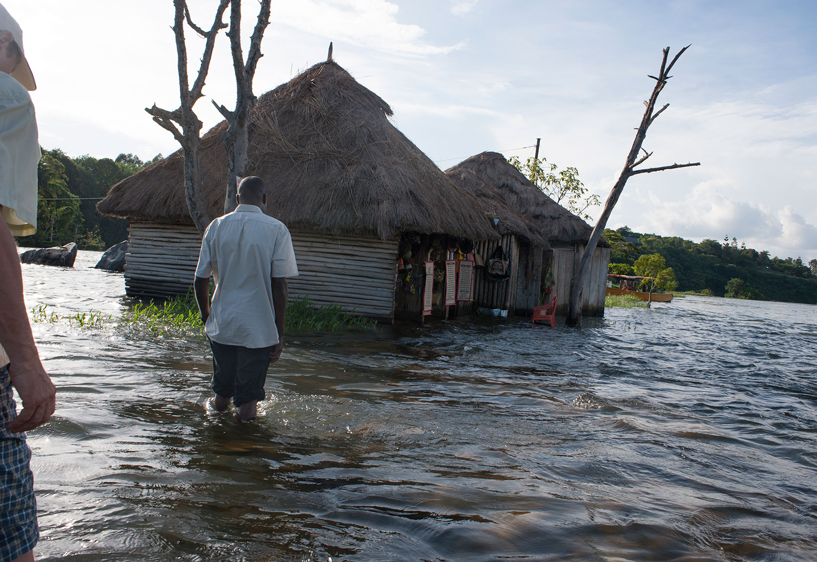 Wir können mit dem Boot zwar noch an einem Stein anlegen, der knapp über die Wasseroberfläche ragt. Von dort aus müssen wir aber durch kniehohes Wasser waten. Auch in den Hütten der Souvenirverkäufer steht das Wasser mindestens noch knöchelhoch. Meine Teva-Sandalen tun hier gute Dienste. Und überhaupt - was sind schon nasse Füße, wenn man von sich behaupten kann, die Spuren eines großen Entdeckers wie John Hanning Speke gekreuzt zu haben. Die Sonne steht schon tief, als wir zurück nach Jinja tuckern. Am Ufer sehen wir insgesamt vier verschiedene Eisvogelarten, Nilwarane und einen Schreiseeadler, der gerade seine Beute verspeist. Schließlich stecken auch noch Fischotter ihre Köpfe aus dem Wasser. Die schöne Bootstour endet am Jinja Sailing Club. Hier gibt es zwar keine Segelboote, dafür aber ein Restaurant, in dessen Garten wir uns ein kühles Bier und frischen Fisch & Chips schmecken lassen.
