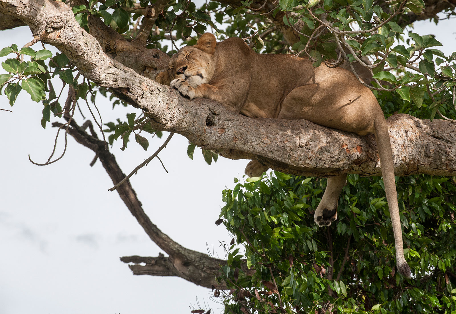 Gleich nach dem Mittagessen brechen wir zu einer Pirschfahrt in den südlichen Teil des Queen Elizabeth Nationalparks auf, den Ishasha-Sektor. Normalerweise ist die Mittagszeit die am wenigsten spannende Zeit für Pirschfahrten. Die Tiere sind dann nicht aktiv, verstecken sich irgendwo im Schatten. Wir fahren trotzdem. Erstens, weil wir nicht im Urlaub sondern auf Info-Reise sind und deshalb nicht so viel Zeit haben. Zweitens ist es bewölkt und nicht zu heiß. Und drittens sind wir in Ishasha. Die Löwen hier sind dafür bekannt, dass sie ihren Mittagsschlaf nicht irgendwo unsichtbar im Gebüsch verbringen, sondern auf die ausladenden Äste der Feigenbäume klettern, um dort zu dösen.