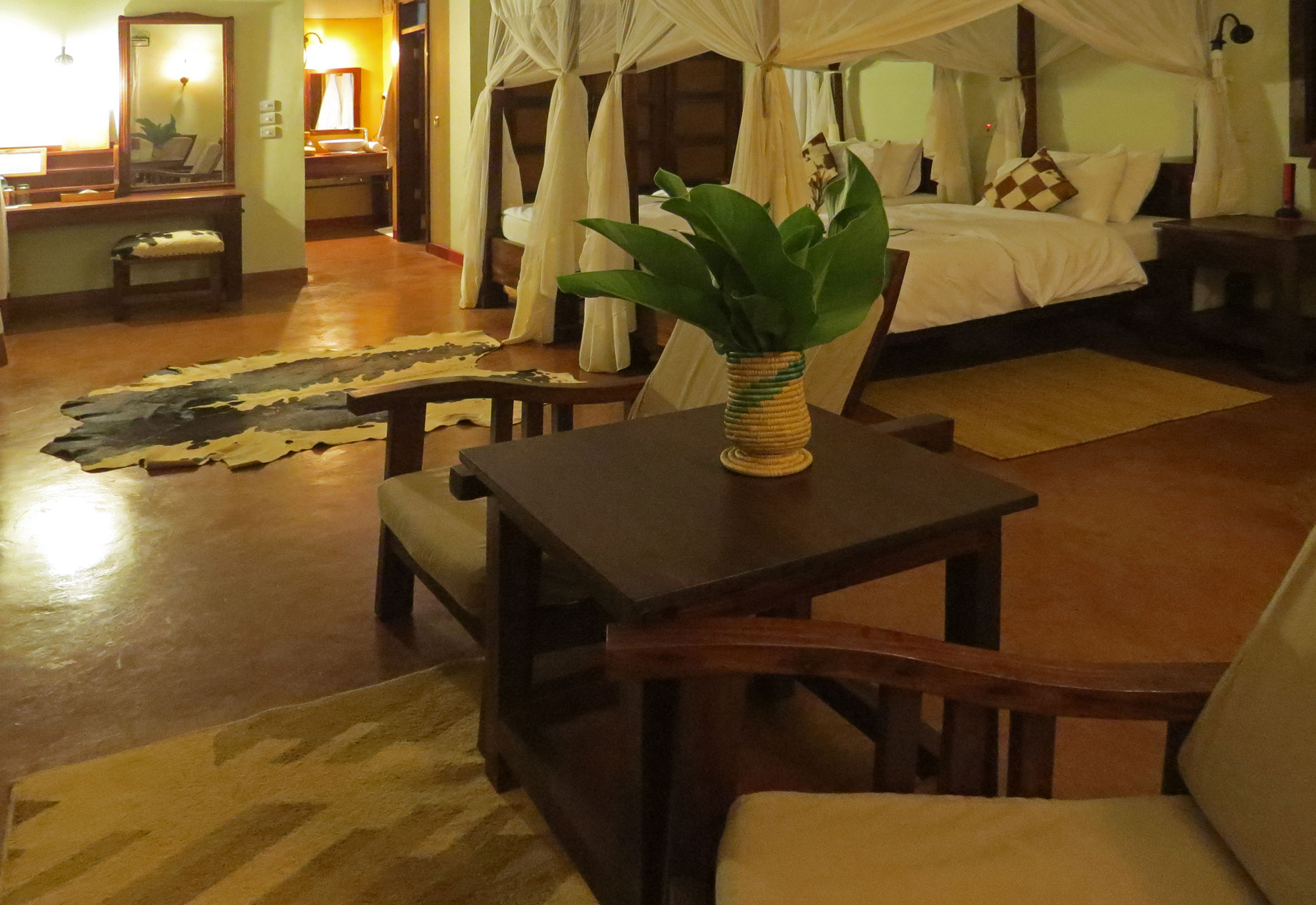 Am nächsten Morgen gibt’s wieder Strom, die Akkus der Kamera sind geladen. Ich lasse die Zimmereinrichtung und Details nochmal auf mich wirken. Es ist wirklich schön hier, man hat sich bei der Dekoration viel Mühe gegeben (wenn auch die Tierhäute als Teppiche bei Vegetariern nicht so gut ankommen dürften). Das Bett ist sehr bequem, die Bettdecke angenehm warm.