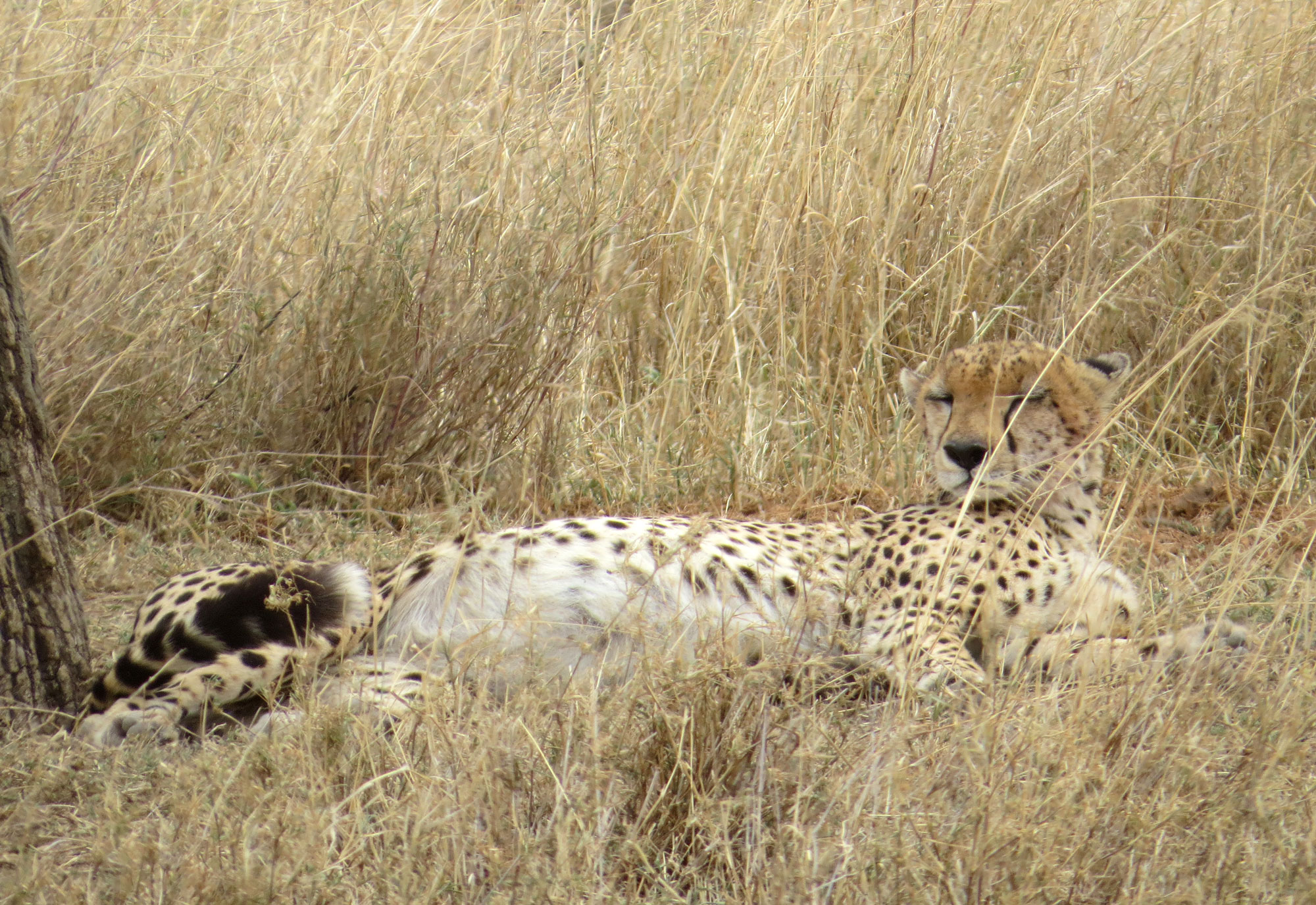 Erick erspäht mit seinen Adleraugen einen Geparden, der gut getarnt unter einem Baum im hohen Gras liegt. Wir warten eine Weile und er dreht sich einmal kurz um, bleibt aber liegen. Einige Thomson-Gazellen wackeln ganz aufgeregt mit dem Schwanz und der Fahrer eines anderen Pirschfahrzeuges teilt uns mit, dass hier eben ein Leopard gesichtet wurde. Also warten wir mit den anderen Fahrzeugen, und tatsächlich lässt er sich blicken - allerdings an einer ganz anderen Stelle als vermutet und auch sehr weit weg. Kurz danach finden wir aber einen friedlich schlummernden Leo in einem Baum und noch einen zweiten später am Nachmittag.