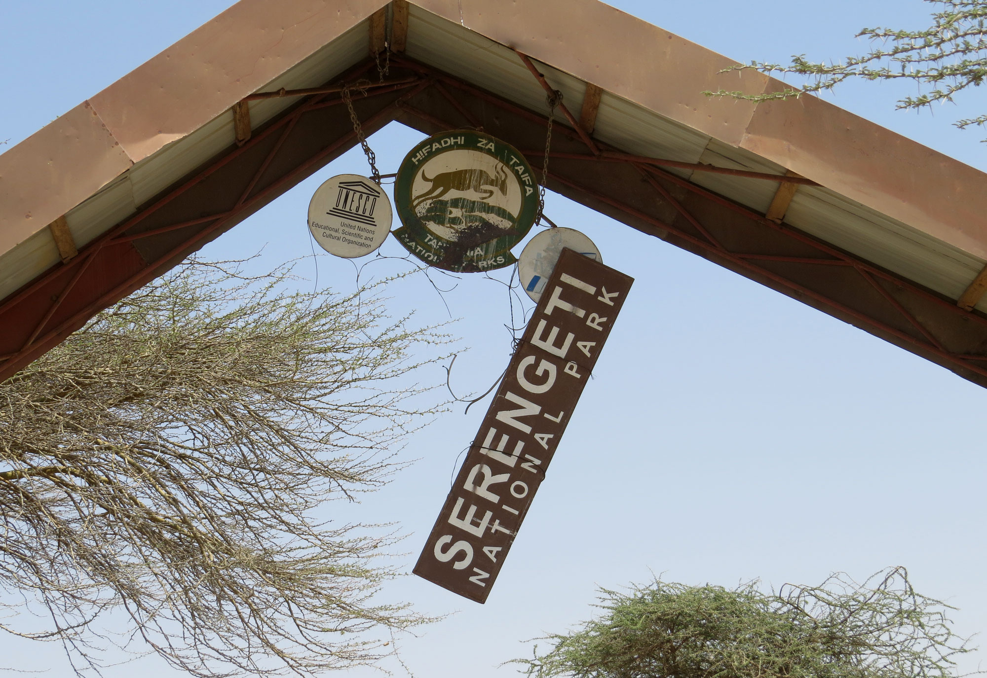 scherzen wir, als wir das Gate passieren. Das Serengeti-Schild hängt nur noch auf einer Seite fest und deshalb natürlich schief. Es ist dunstig, einige Fahrzeuge vor uns haben ordentlich Staub aufgewirbelt. Eine Schar Geier treibt ihr Unwesen in der weiten Ebene. Leider sind sie sehr weit entfernt und wir sehen deshalb nicht, was für ein Kadaver da liegt. Ein paar Impalas und Kuhantilopen grasen in aller Seelenruhe.