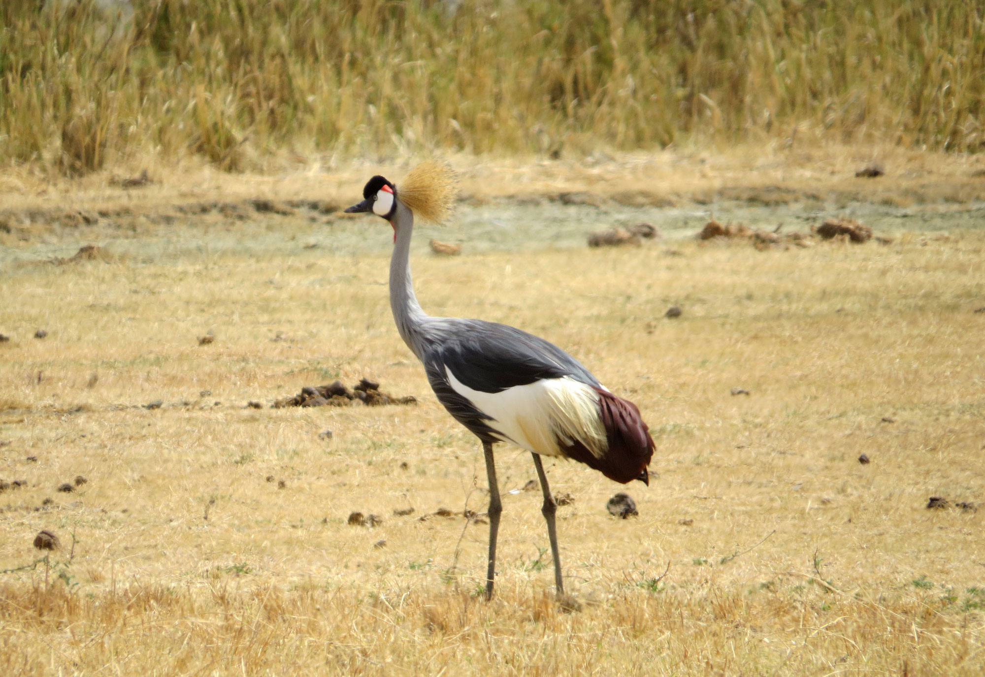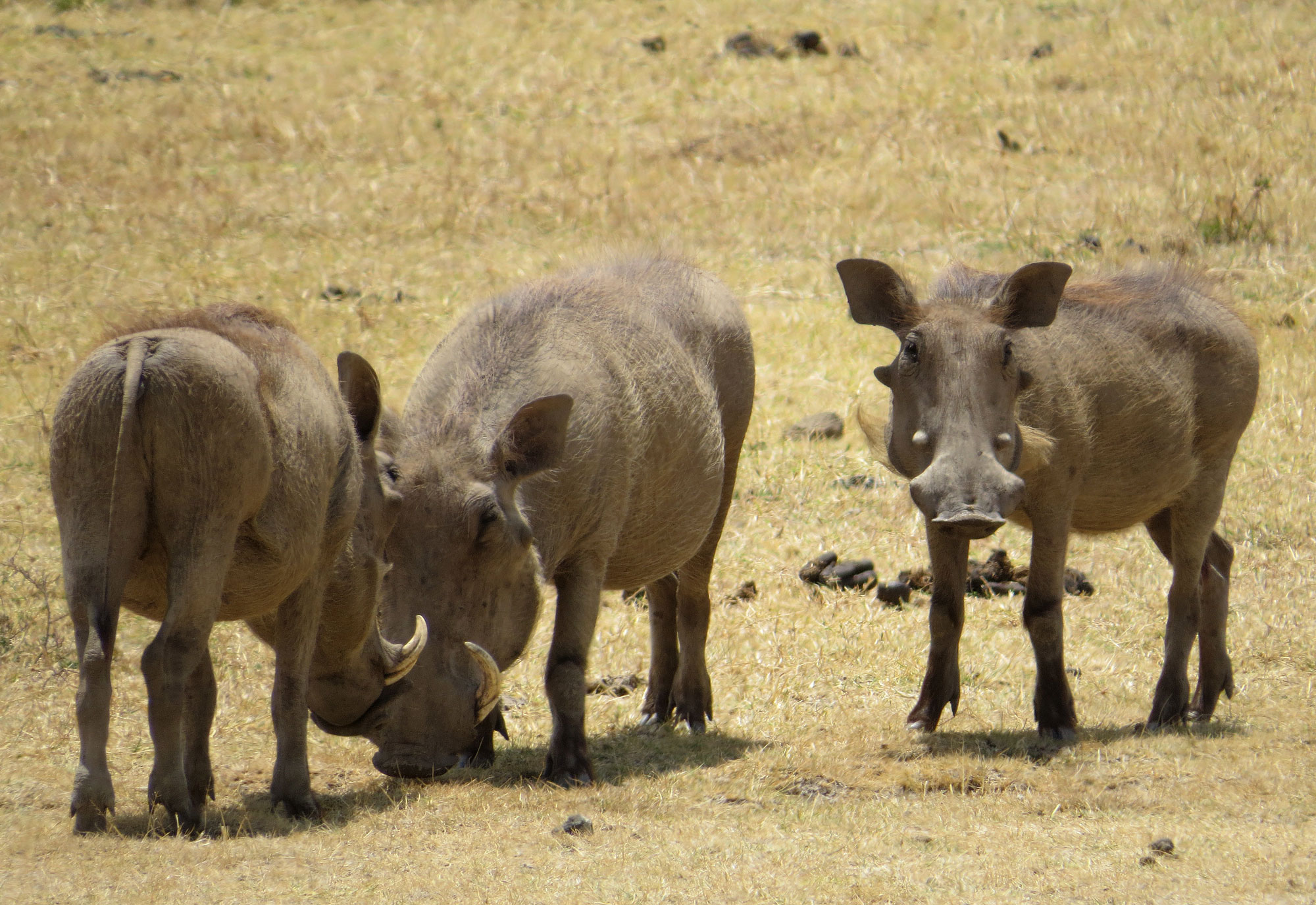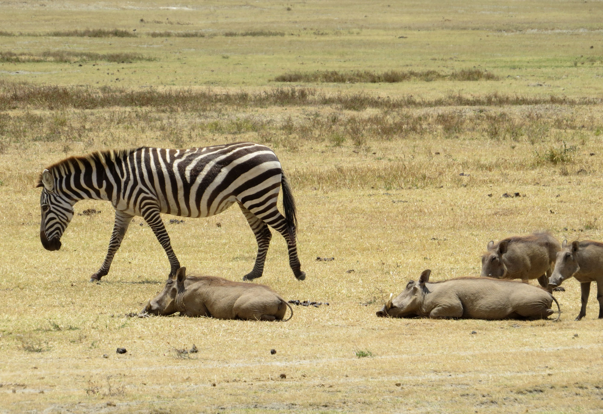 Unten angekommen erstreckt sich vor uns eine weite, fast baumlose Ebene. Der Horizont flimmert in der Hitze der Mittagssonne. Unser Adlerauge Erick erspäht im Dunst einen dunklen Fleck, ein Nashorn. Diese Beobachtung hat echten Seltenheitswert, denn es gibt hier nur insgesamt 15 Nashörner und die tarnen sich in dem dunklen Gestein sehr gut. Mithilfe des starken Kamerazooms gelingen tatsächlich einige Fotos, die Ericks Beobachtung beweisen. Später werden wir noch eins zu sehen bekommen, allerdings auch sehr weit entfernt. Ein Rudel Warzenschweine sucht nach etwas Fressbarem, Zebras, Gnus, Thomson-Gazellen und ein Kronenkranich lassen sich kaum stören.