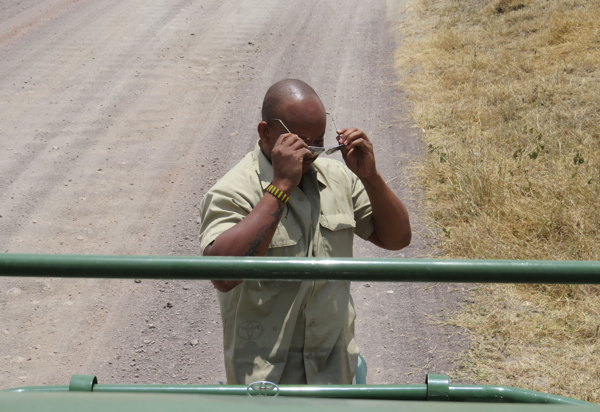 Nach einem Fotostopp für ein dösendes Hyänenrudel will plötzlich unser Auto nicht mehr anspringen. Erick muss das schützende Gefährt verlassen und es stellt sich heraus, dass die Motorhaube lose ist und deshalb den Batteriekontakt unterbricht. Erick gibt alles, um die Haube zu schließen. Die Hyänen sind zum Glück träge und blinzeln nur einmal kurz herüber. Der Motor springt an, wir fahren weiter. Plötzlich fällt Erick auf, dass seine Sonnenbrille verschwunden ist - er hatte sie vorn in den Kühlergrill gehängt. Also wieder raus aus dem Wagen. Die Brille hängt tatsächlich noch am Grill und wird unter großem Hallo wieder aufgesetzt.