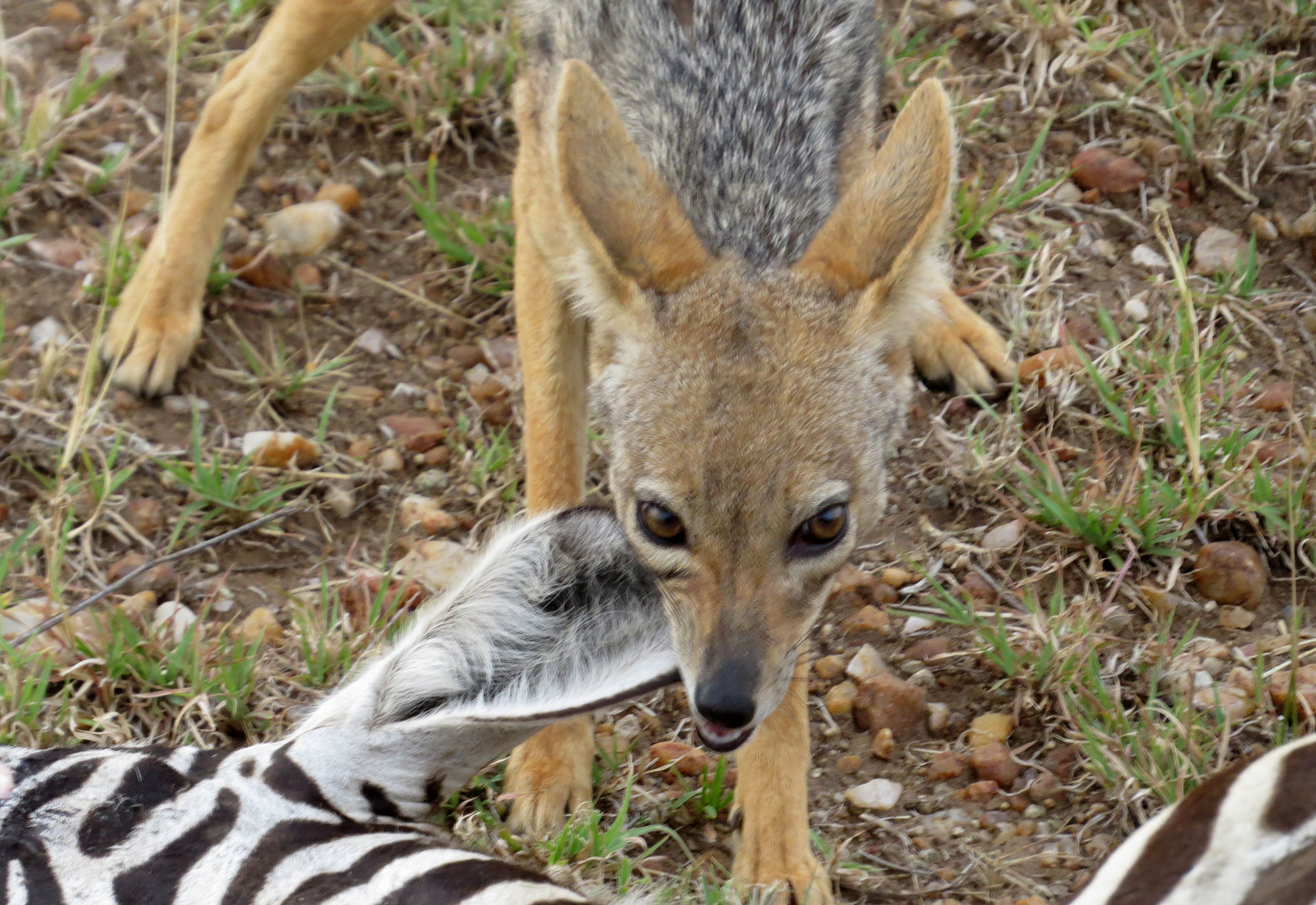 Am nächsten Morgen machen wir uns auf den Rückweg in Richtung Ngorongoro. Unterwegs begegnen wir noch einem Geparden und außerdem einigen Schakalen, die versuchen, ein totes Zebra anzuknabbern. Man sieht keine Verletzungen bei dem Tier , vermutlich wurde es in der Nacht angefahren. Die kleinen Schakalschnauzen können die dicke, lederne Haut nicht aufbrechen und so nagen kleinen Jäger am Kopf und Ohr des Zebras herum.