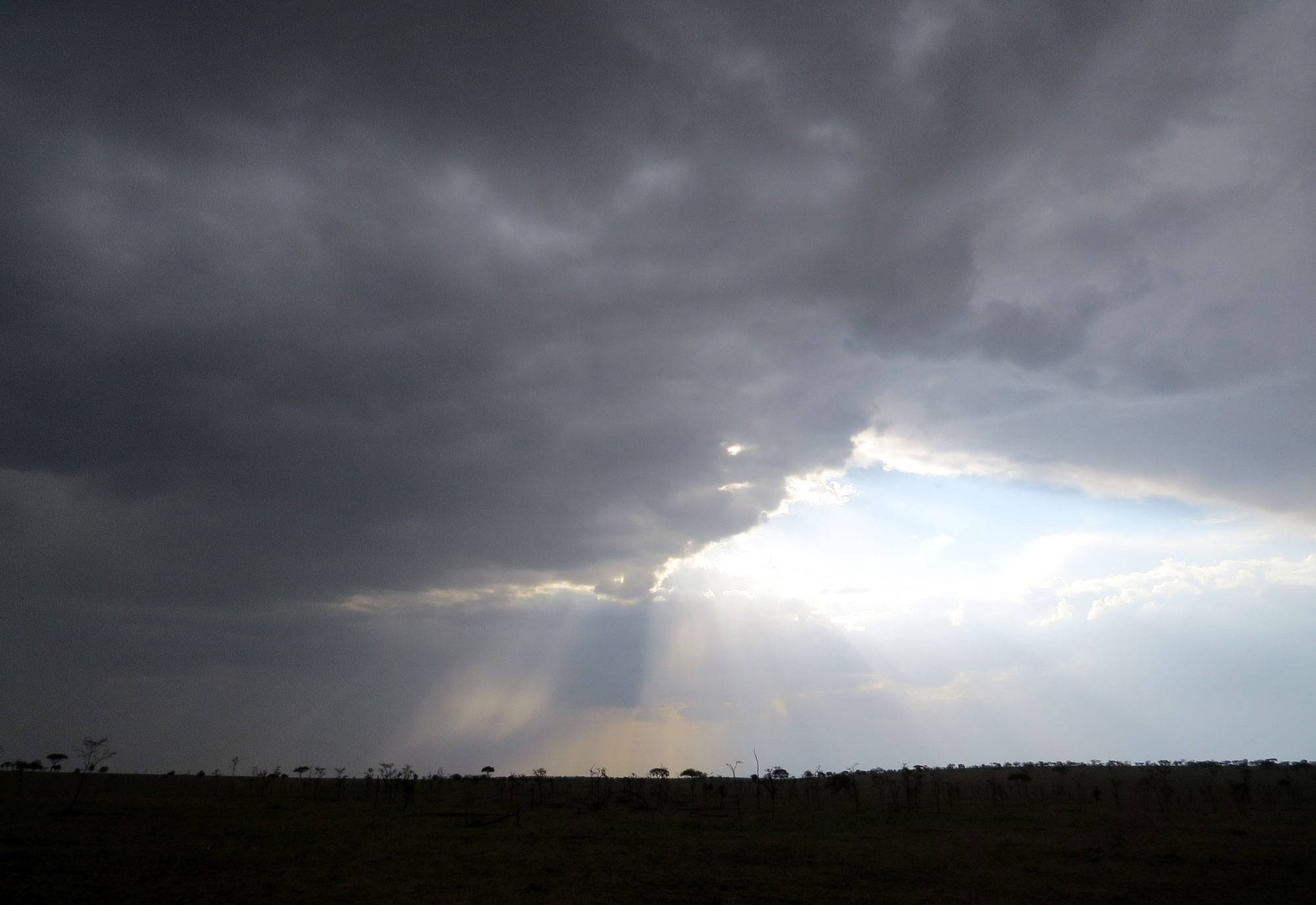 Am Himmel brauen sich bedrohlich dunkle Wolkenberge zusammen, erste Blitze zucken am Horizont. Eine Regenfront zieht über das trockene Land. Wir bekommen auch einen kurzen Schauer ab und schließen das Hubdach. Es hat keinen Zweck - wir werden heute nichts mehr zu sehen bekommen, die Tiere haben sich zurückgezogen. Das ist angesichts der tollen Tiersichtungen am Vormittag aber verschmerzbar.