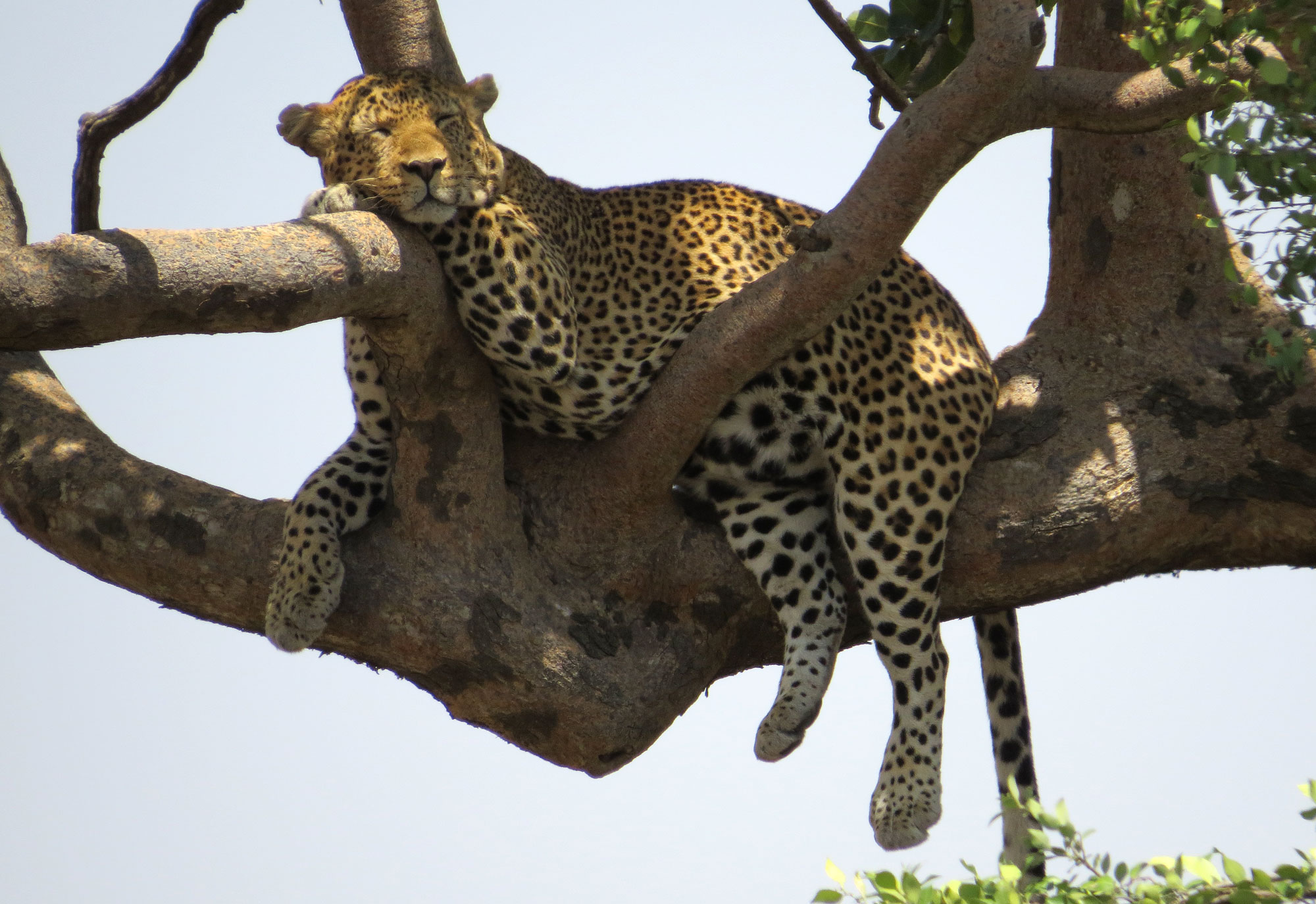 An einem Toilettenhäuschen treffen wir auf ein anderes Pirschfahrzeug und bekommen den Tipp, dass unweit des Seronera-Airstrips ein Leopard im Baum hängt. Er ist zum Glück auch vollgefressen und verlässt seinen Schlafplatz in den nächsten Stunden nicht, so dass wir ihn auch sehen und schöne Fotos machen können.