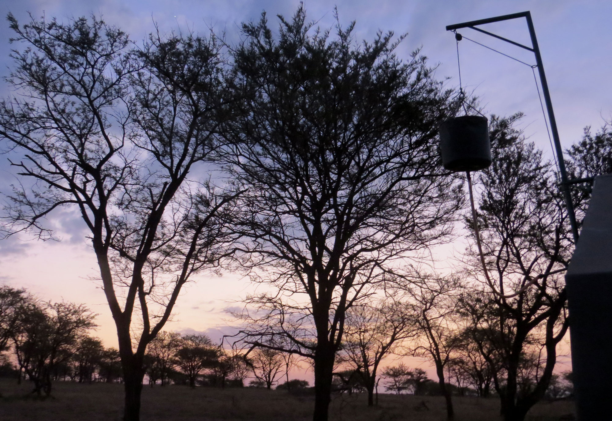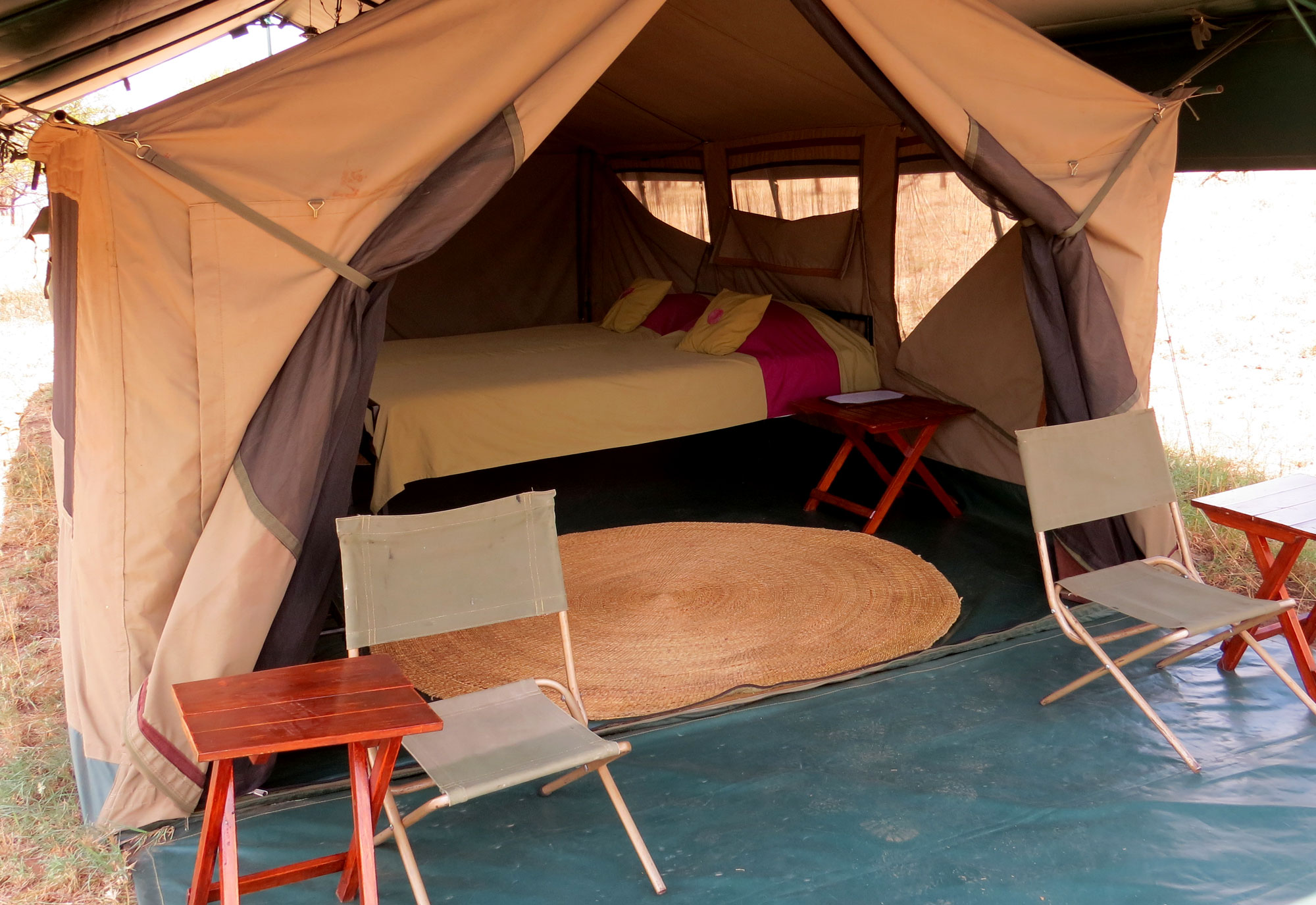 Die Zelte sind geräumig und funktional eingerichtet. Im vorderen Teil stehen zwei Betten, ein Ablagetisch und ein Kleiderständer, sogar mit Kleiderbügeln. Der Bereich ist in sich abgeschlossen, wenn der vordere und hintere Reißverschluss zugemacht werden. In der Apsis befindet sich ein Badezimmer, bestehend aus zwei Kabinen. Eine beherbergt die Trockentoilette, die andere die Dusche. Wasser kommt aus einem Sack, der von den Angestellten von außen befüllt wird. Eine Schüssel nebst Krug und einem Eimer unter dem Abfluss dient als Waschtisch. Im Messezelt werden die Mahlzeiten serviert. Am heutigen ersten Abend ist es voll, alle Plätze sind besetzt und die Campmitarbeiter müssen viel laufen. Das Küchenzelt liegt eine gute Strecke entfernt. Das Essen ist ordentlich, kulinarischen Chichi kann man hier nicht erwarten, denn die Versorgungswege sind weit. Den Gin&Tonic gibt es nur ohne Eis, dafür aber mit Lagerfeuerromantik.