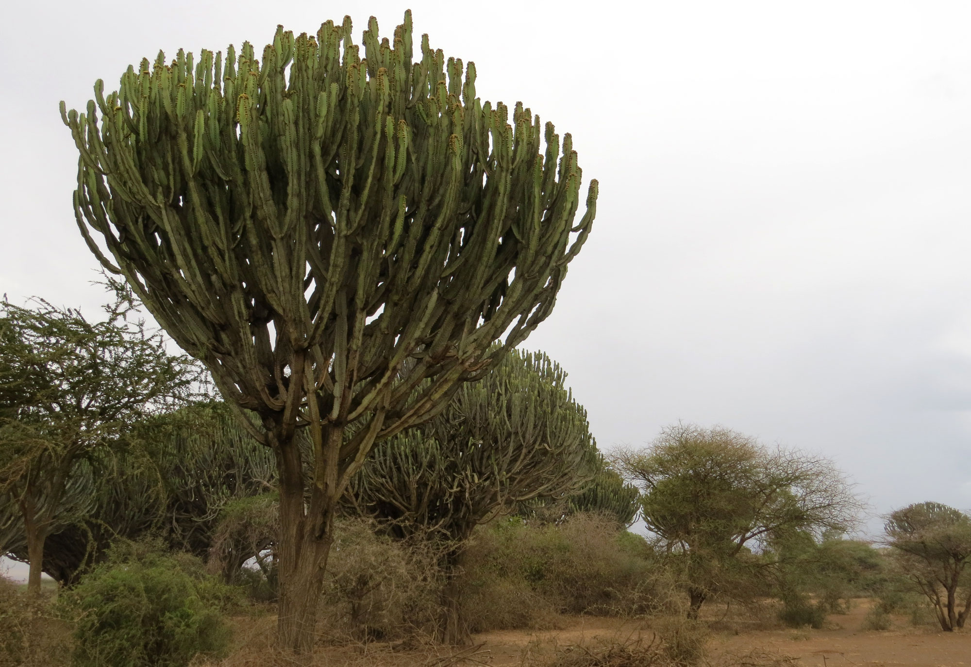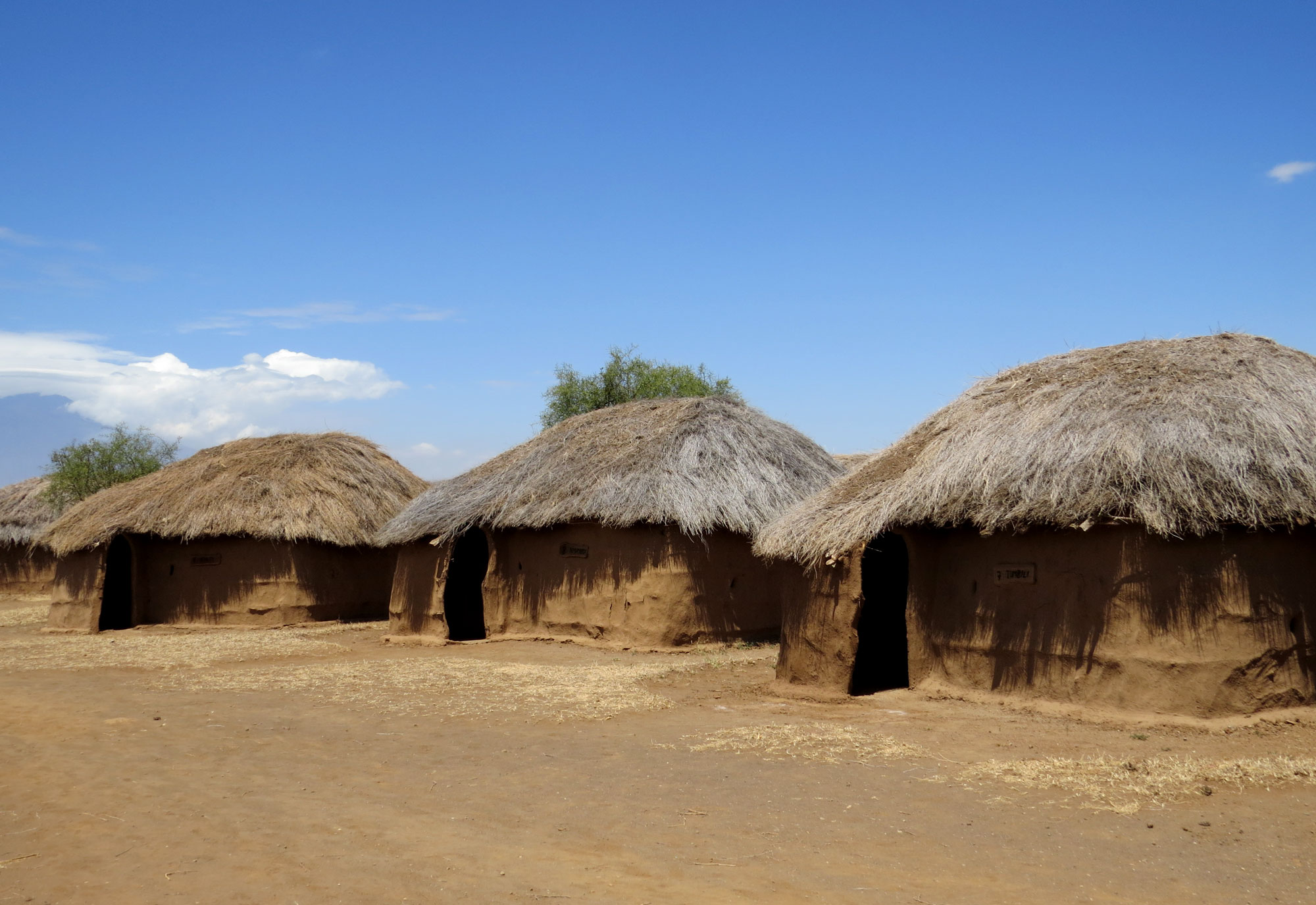 Freddy, unser Guide, geht mit mir noch einmal zum Tor hinaus. Zwei Giraffen knabbern unweit des Dorfes ungerührt an den Bäumen. Danach schauen wir uns die Anlage an, bevor wir eine Einführung in die Geschichte und Lebensweise der Massai bekommen.Olpopongi ist nach einer Euphorbie benannt, einem Wolfsmilchgewächs, das wie eine Mischung aus Baum und Kaktus aussieht und giftig ist. Trotzdem verwenden die Massai die stabilen Zweige in den Dachkonstruktionen ihrer Hütten, denn das Gift hält Schädlinge fern. Die Dachbalken sind der einzige Teil des Hauses, für den die Männer zuständig sind. Alles andere bauen die Frauen und es kann bis zu einem Jahr dauern, bis ein Haus fertig ist. In den Dörfern hat jede Frau mit ihren Kindern ein Haus, der Mann pendelt also zwischen den Häusern, wenn er mehrere Frauen hat.