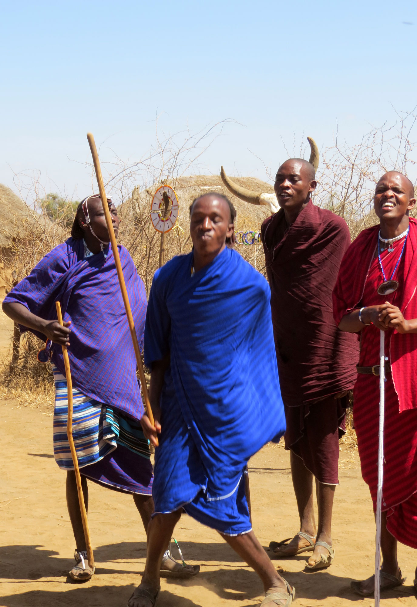 Wir erreichen das Dorf, das aus Lehmhütten und einem Zaun aus Dornenzweigen besteht. Die Massai erwarten uns bereits und begrüßen uns mit traditionellem Gesang und Tanz. Die vier Männer und sechs Frauen tragen die traditionelle Kleidung. Die Frauen haben große Halsreifen aus Perlen angelegt, die im Rhythmus auf und nieder wippen.