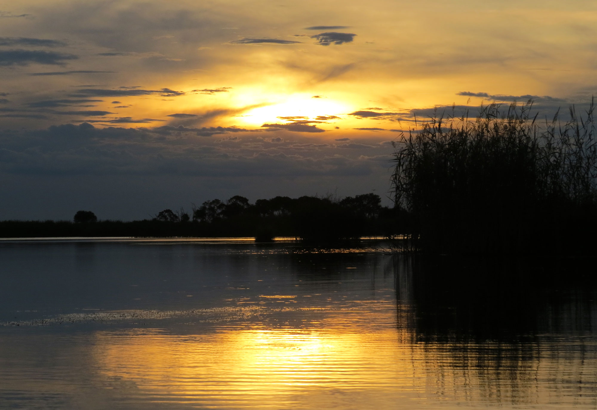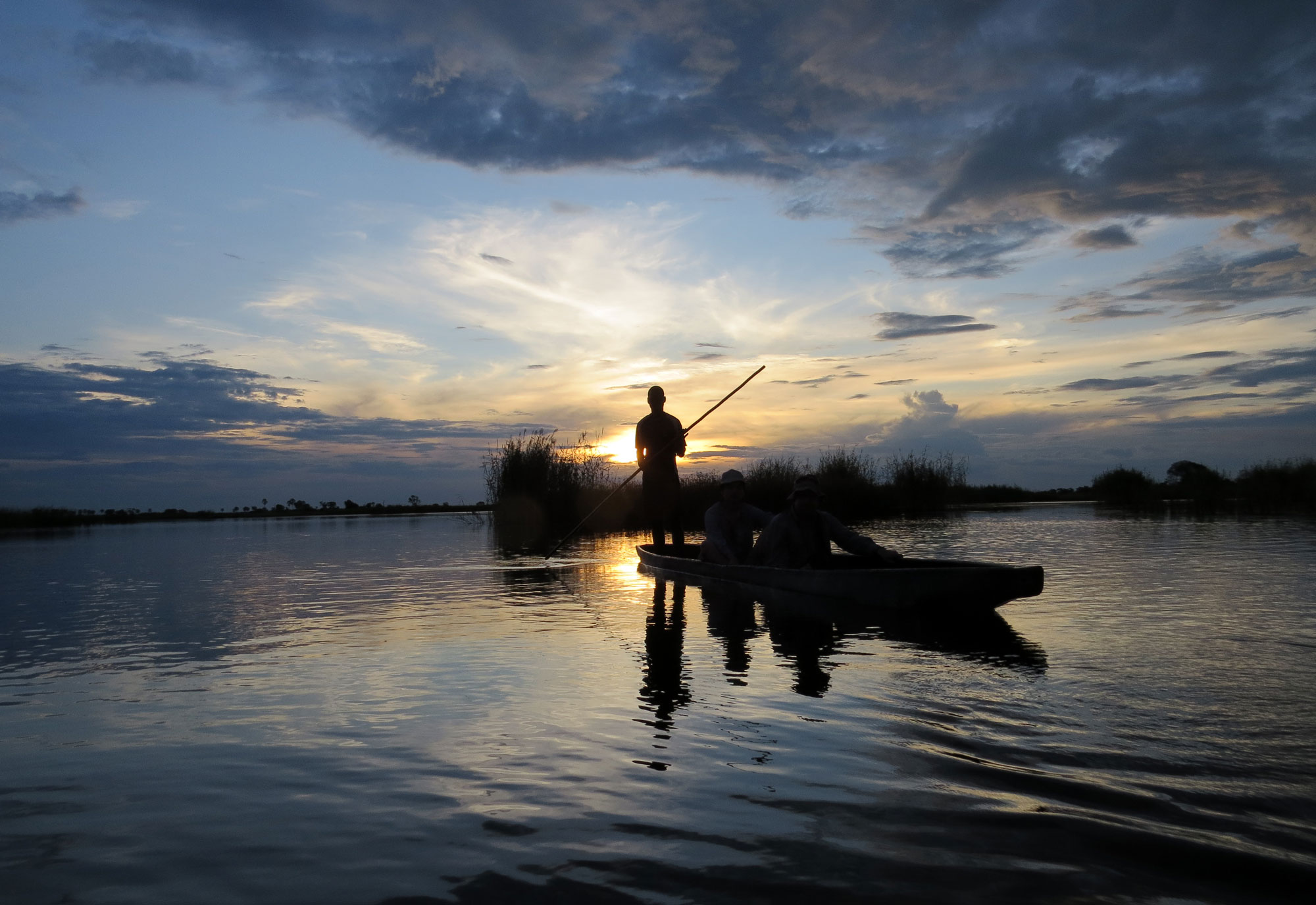 Anschließend halten wir in der Mittagshitze eine kleine Siesta. Am späten Nachmittag ziehen wir dann im Gänsemarsch zu einer Wanderung los. Der Boden ist hier größtenteils fest und trocken. Überall ragen riesige Termitenhügel empor. Wir sehen auch einige Reifenspuren. Hier ist offenbar auch schon mal ein Allradfahrzeug gefahren. Viele Gebiete des Deltas sind saisonal trocken und befahrbar, in der Regenzeit verwandeln sie sich jedoch in Inseln oder werden komplett überflutet. Das Gras steht hoch, einige Zebras und Gnus beobachten uns aus sicherer Entfernung, immer bereit zur Flucht. In einer flachen Lagune tummeln sich einige Flusspferde. Sie dösen den kühleren Abendstunden entgegen und grunzen entspannt vor sich hin. Die Sonne geht unter und färbt den Himmel golden, später rosa- und lilafarben. Die Poler sitzen in den Mokoros am Wasser und ahmen den Ruf von Fröschen nach, schwatzen und lachen. Wir essen zu Abend und lassen am Lagerfeuer den Tag Revue passieren.