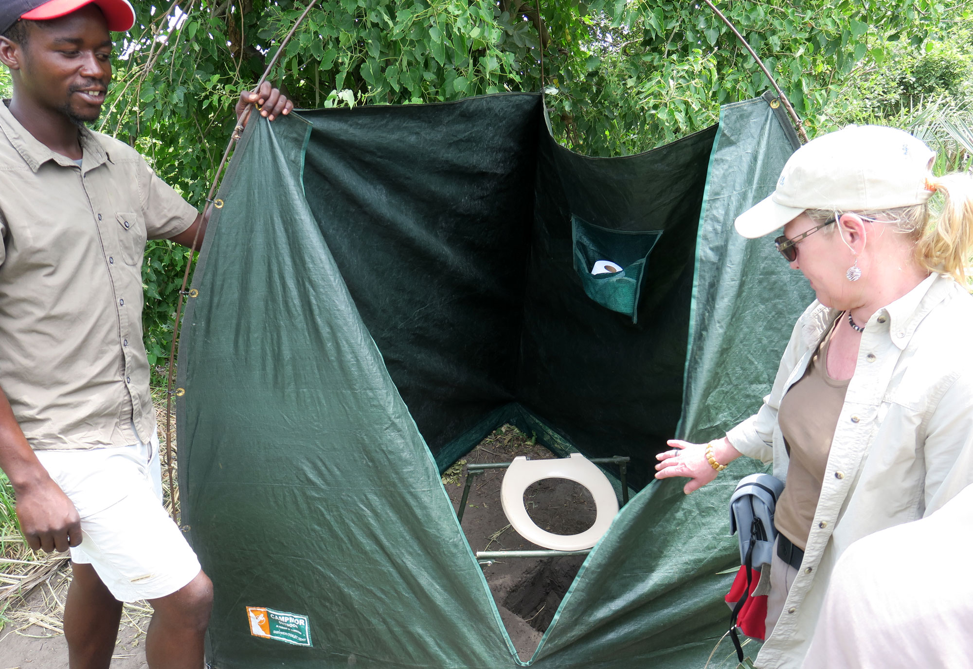 Die „offizielle“ Toilette ist im Gebüsch unweit des Camps versteckt. Es ist ein Sichtschutz rund um ein Loch im Boden, über dem sich eine Klobrille auf einem Gestell befindet. Wer sie benutzt, nimmt den Spaten mit und schippt nach dem Geschäft einfach eine Schaufel Erde in das Loch. Die Hände kann man sich dann in einer portablen Waschschüssel waschen. Einfach, aber völlig ausreichend und hygienischer als es sich anhört.