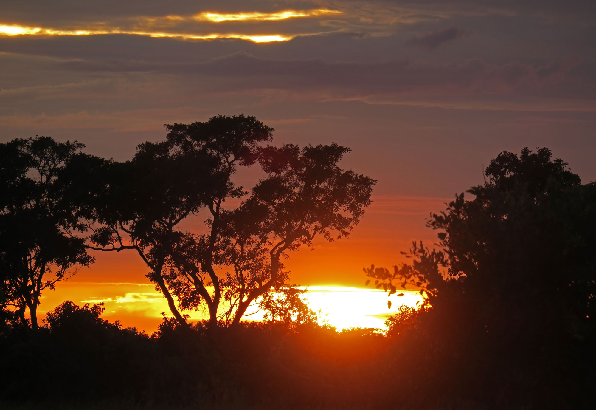 Am späten Nachmittag fahren wir noch einmal los in den Sonnenuntergang. Wir sehen Kormorane in den Bäumen und einen Büffel, der am Ufer grast. Irgendwo grunzen die Flusspferde. Die untergehende Sonne spiegelt sich im Wasser, der Himmel färbt sich indigoblau - ein wunderschöner Anblick! Zurück im Camp wird das Abendessen serviert und die Poler erfreuen uns später noch mit Gesang und akrobatischem Tanz.