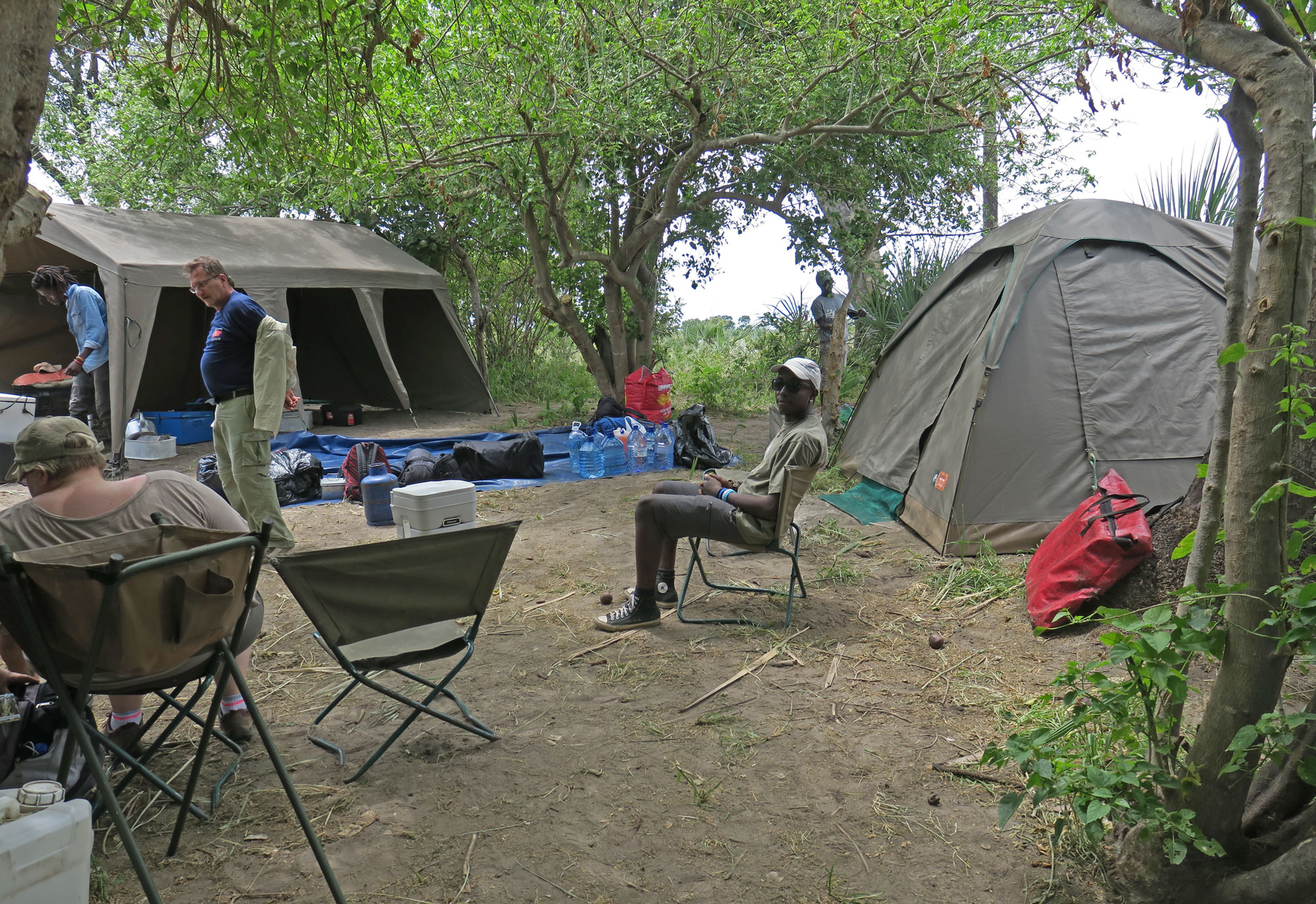 Das Zeltcamp, das vorab für uns aufgebaut wurde, besteht aus drei Kuppelzelten sowie einem offenen Küchenzelt. Ein umgedrehtes Mokoro dient dabei als Anrichte und Tisch. Die Kuppelzelte sind 2 x 2 Meter groß und man kann in ihnen leicht gebückt stehen. Sie beherbergen zwei Feldbetten mit Kissen und Decken. In einem Anbau befindet sich eine Campingtoilette, die für nächtliche Bedürfnisse im Notfall gedacht ist. Wir haben sie nicht ein einziges Mal benutzt.