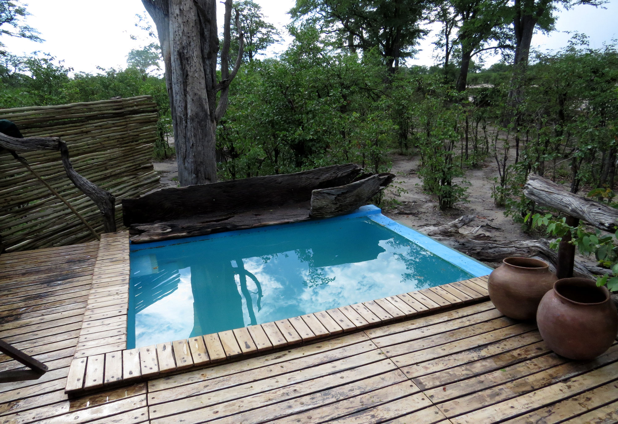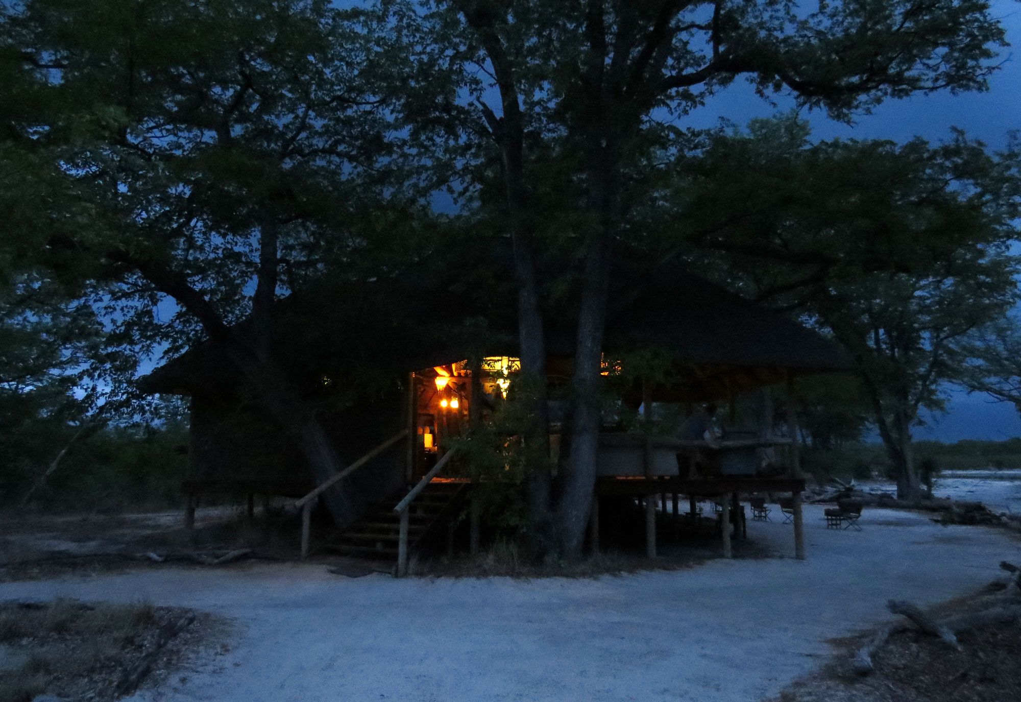 Hyena Pan hat eine schöne, offene Lounge auf einer Plattform und es wird auch allabendlich ein Lagerfeuer entzündet. In der Dunkelheit kommen die Tiere ans Wasserloch und wir sehen einen stattlichen Elefantenbullen. Bei klarem Himmel hat man hier auch einen wunderbaren Blick auf den Sternenhimmel. Bruce, der aus Simbabwe stammt und in Hwange Wildhüter war, kennt sich bestens aus und freut sich, wenn Gäste interessiert sind und Fragen stellen. Er zeigt uns Fotos von einem neuen Projekt. Rund 7 Kilometer von Hyena Pan werden Plattformen aufgebaut, auf denen die Gäste unter freiem Himmel in luftiger Höhe schlafen können. Bruce will außerdem „Elephant tracking“ im Busch anbieten.