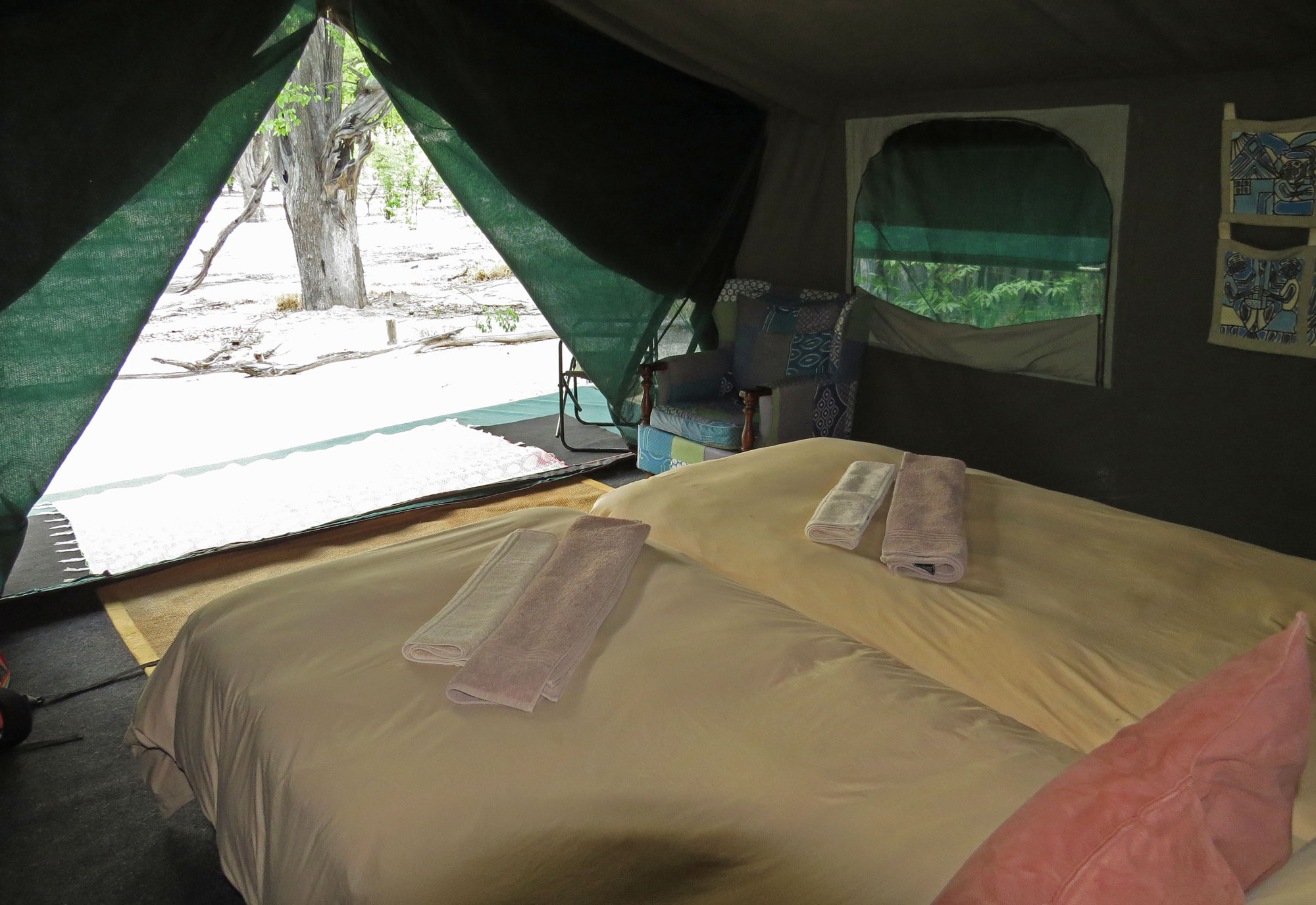Bruce, der mit seiner Frau Barbara das Camp als Urlaubsvertretung betreut, sich aber in der Gegend sehr gut auskennt, erklärt uns das Phänomen. Wenn der Okavango Hochwasser führt, bringt er auch gelöste Salze mit. In den Hauptadern des Deltas werden diese durch die vielen Pflanzen herausgefiltert. In den Ausläufern des Deltas versickert das Wasser zusammen mit dem Salz und es kommt zu einer Versalzung des Bodens. Pumpt man das Wasser wieder an die Oberfläche, so enthält es noch viele Mineralien und schmeckt salzig. Die Tiere scheinen das Salz im Wasser zu mögen.