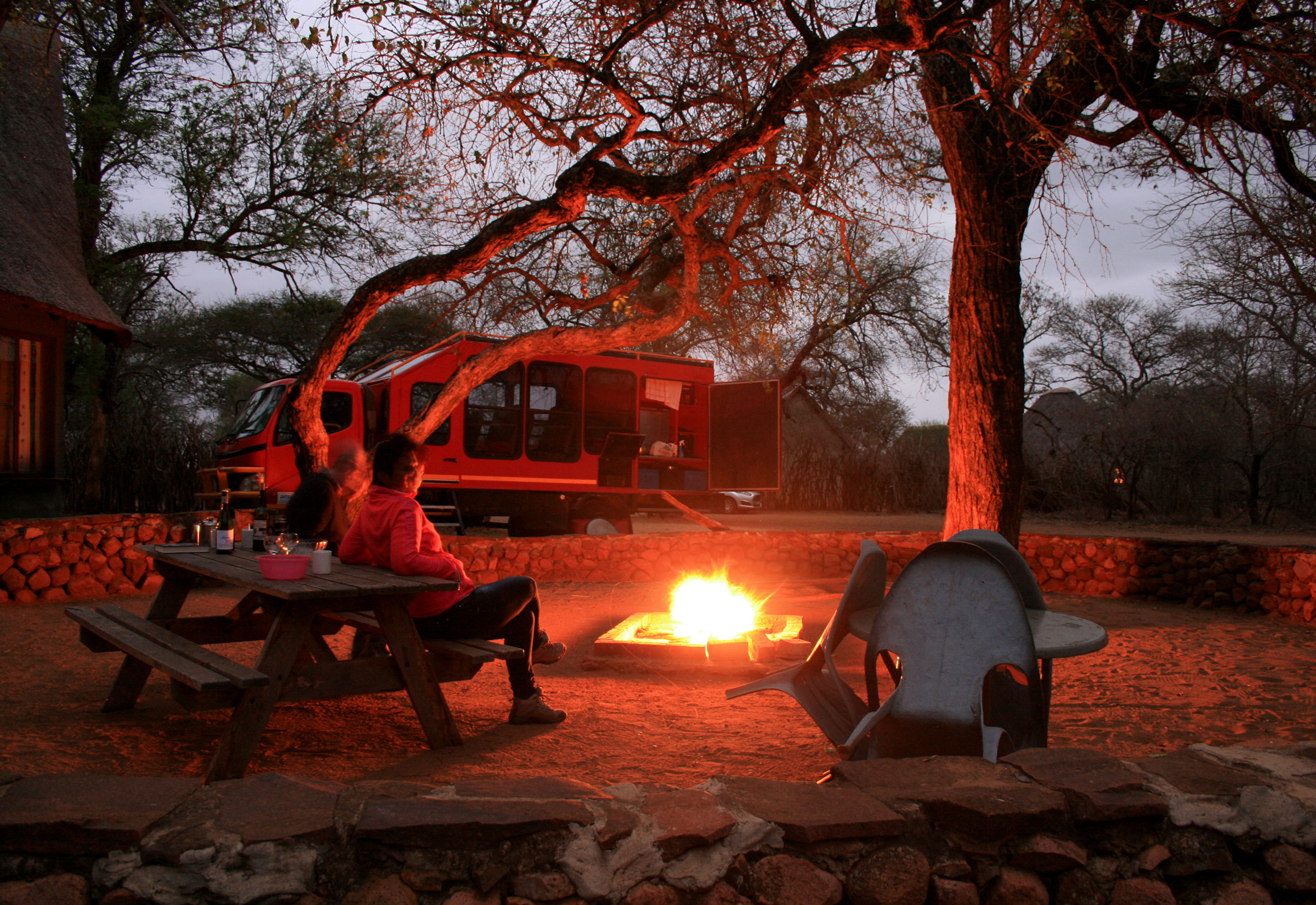 Als wir zu unserer Unterkunft zurückkehren, ist es bereits dunkel. Das Lagerfeuer knistert. Ein Aperitif, während wir auf unser Abendessen warten, rundet die Abendstimmung ab. Kein Strom, kein W-Lan, dafür Ruhe, ein gemeinsames Wohnzimmer, Küche, Bad, Petroleumlampen und eine Feuerstelle. Für die Frischluftliebhaber sogar eine Außendusche, die gleich getestet wird.